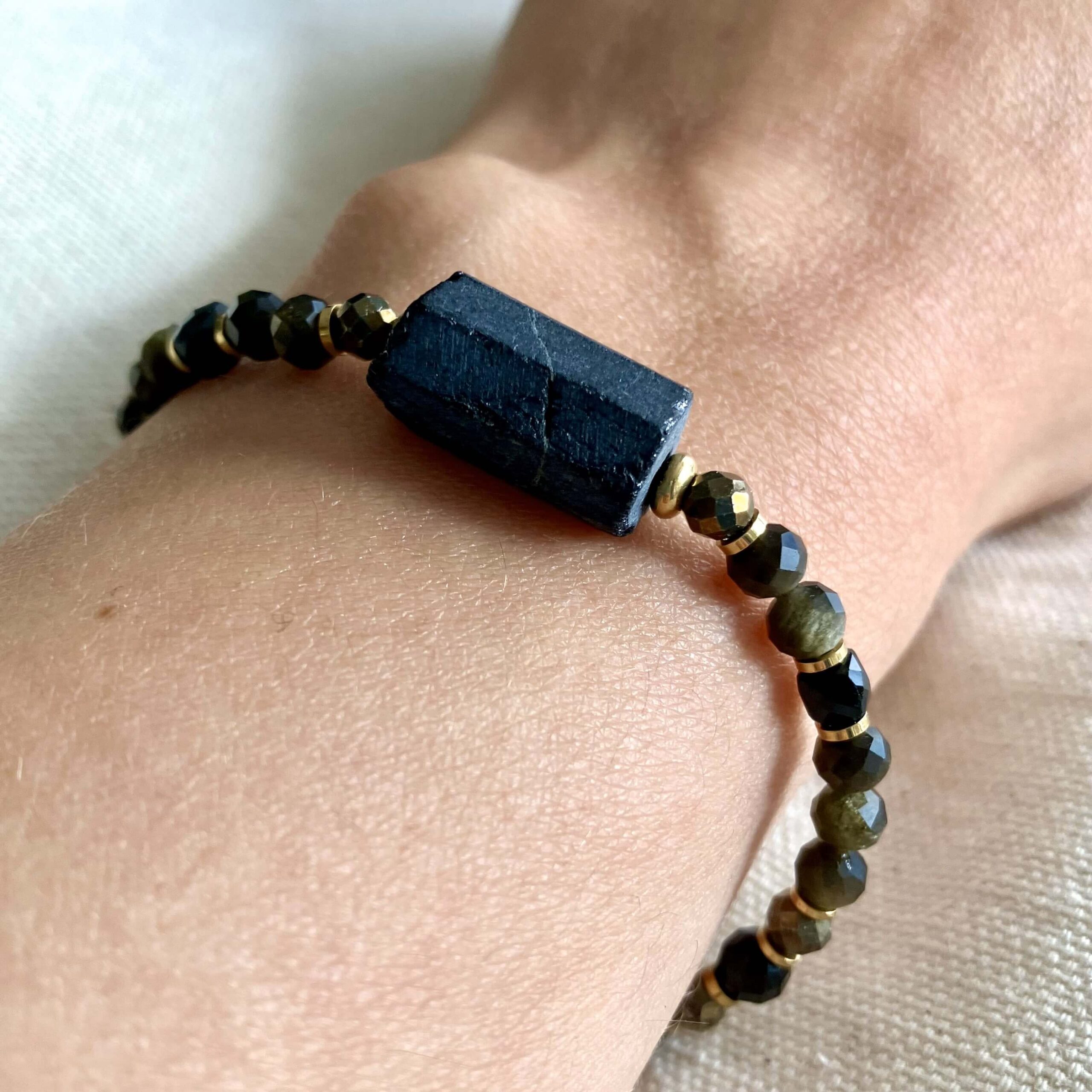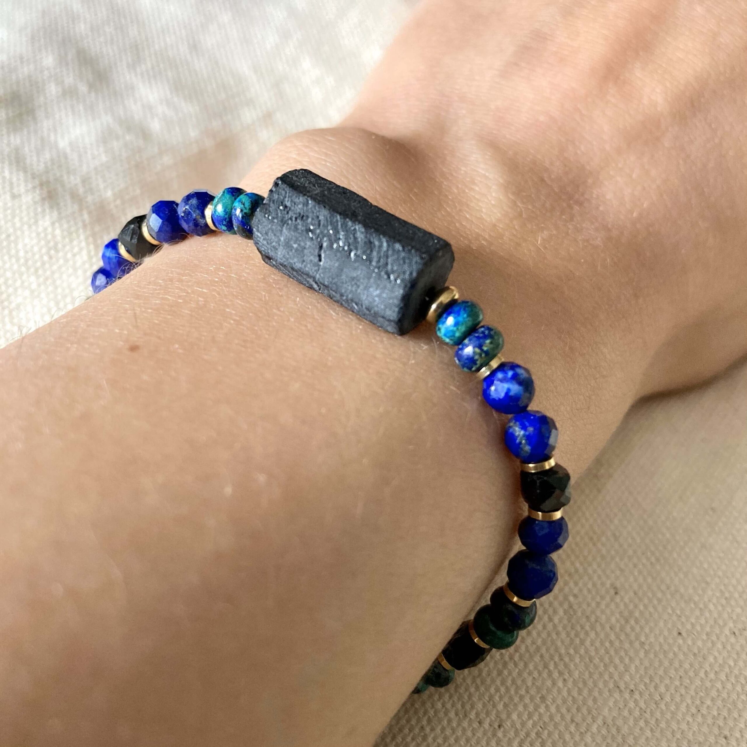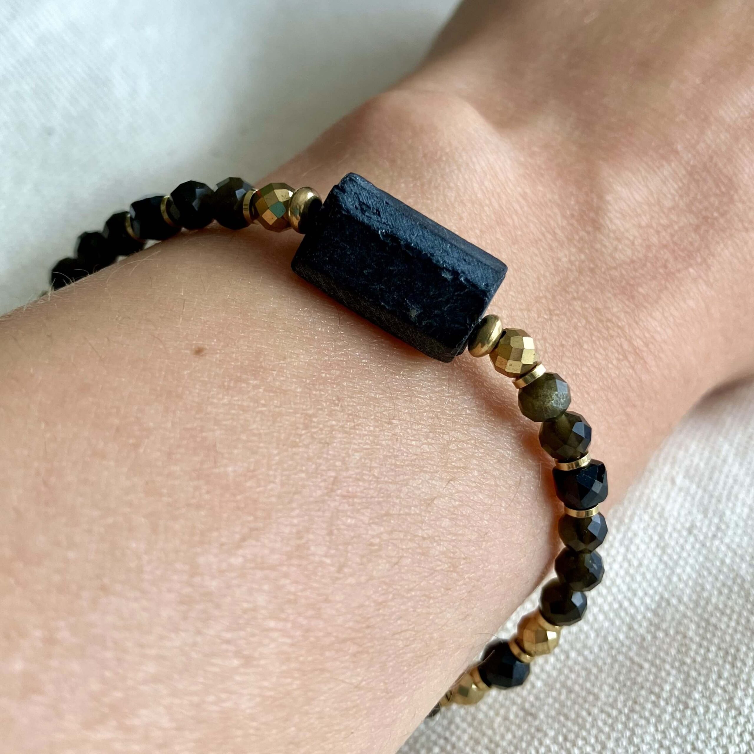 Bransoletka jest ręcznie robiona, powstała w pojedynczym, unikatowym egzemplarzu. Wykonana z naturalnych kamieni, różnych połączeń kamieni: czarnego i zielonego turmalinu, pirytu, hematytu, tygrysiego oka, chryzokoli, lapis lazuli, tanzanitu, granatu, złotego i srebrnego obsydianu. Turmalin jest w surowej formie, a pozostałe kamienie są fasetowane, co znaczy, że mają specjalny szlif dzięki, któremu pięknie odbijają światło. Bransoletka daje świetlisty i migoczący efekt.