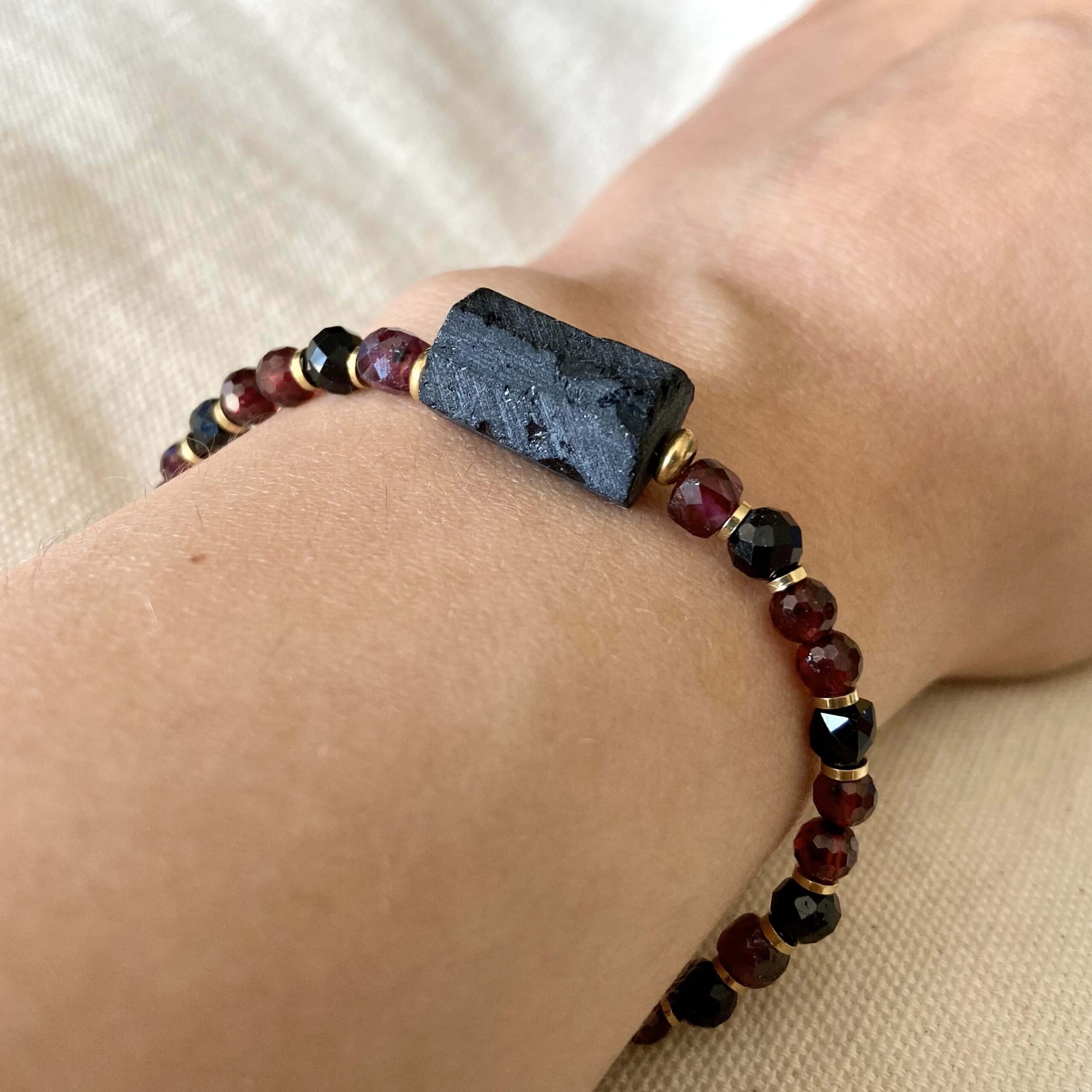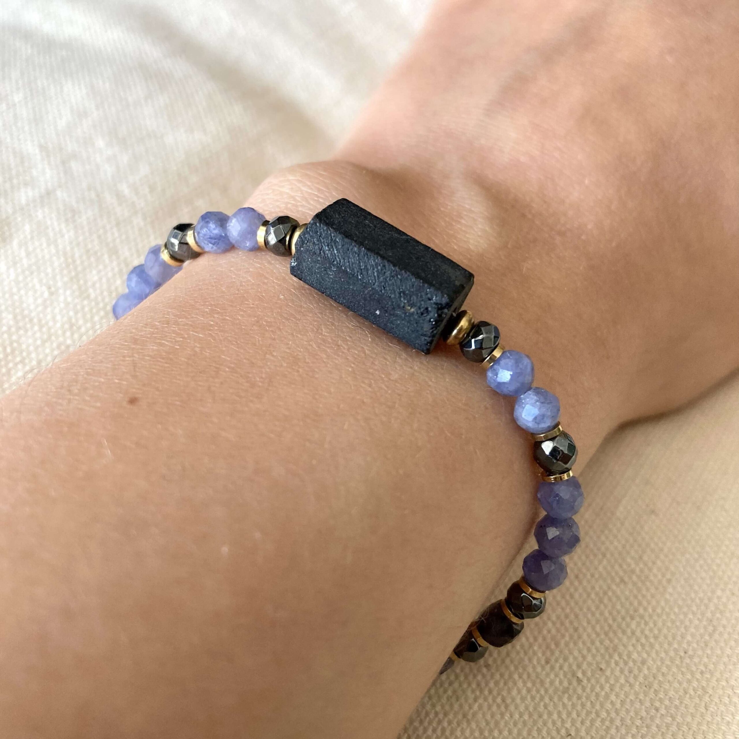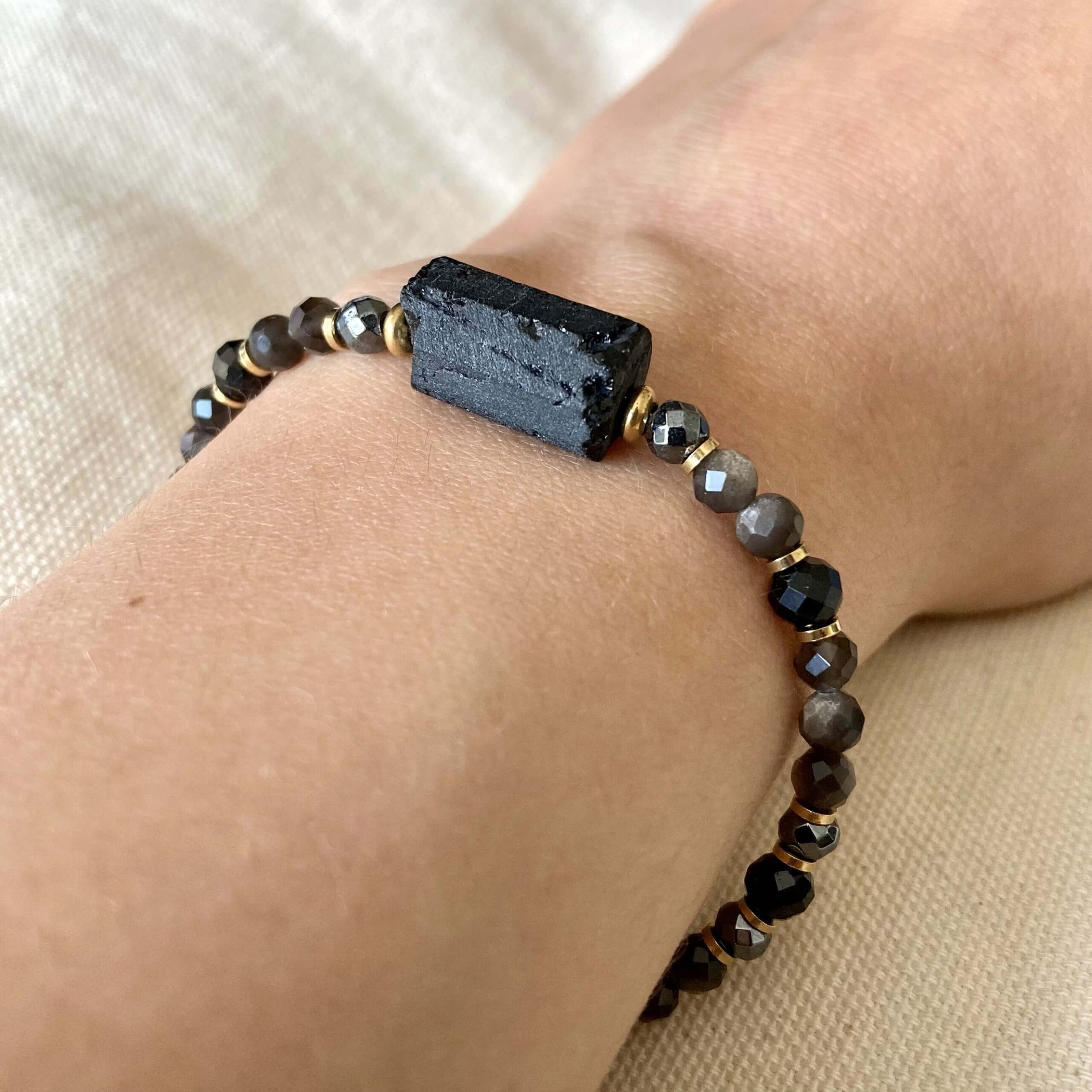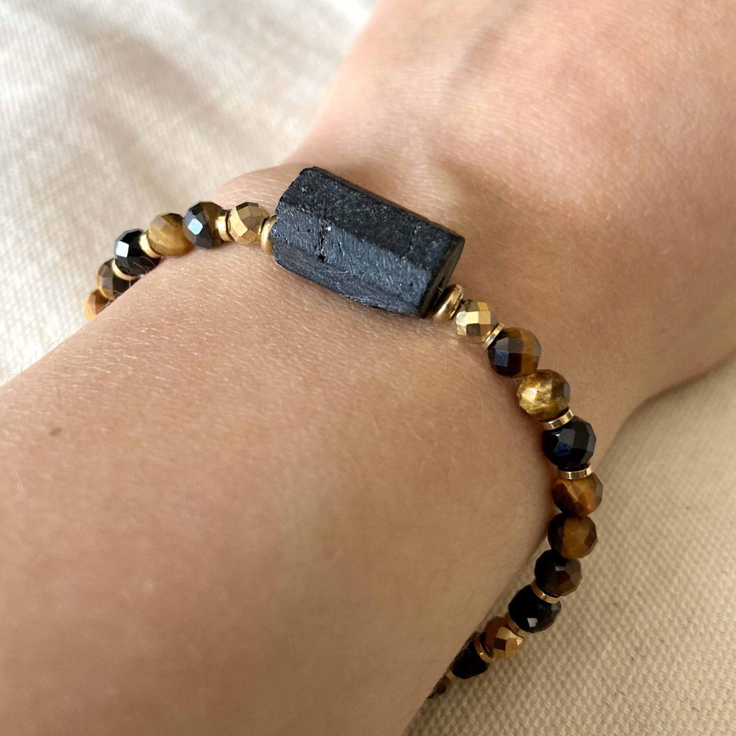 Bransoletka jest ręcznie robiona, powstała w pojedynczym, unikatowym egzemplarzu. Wykonana z naturalnych kamieni, różnych połączeń kamieni: czarnego i zielonego turmalinu, pirytu, hematytu, tygrysiego oka, chryzokoli, lapis lazuli, tanzanitu, granatu, złotego i srebrnego obsydianu. Turmalin jest w surowej formie, a pozostałe kamienie są fasetowane, co znaczy, że mają specjalny szlif dzięki, któremu pięknie odbijają światło. Bransoletka daje świetlisty i migoczący efekt.