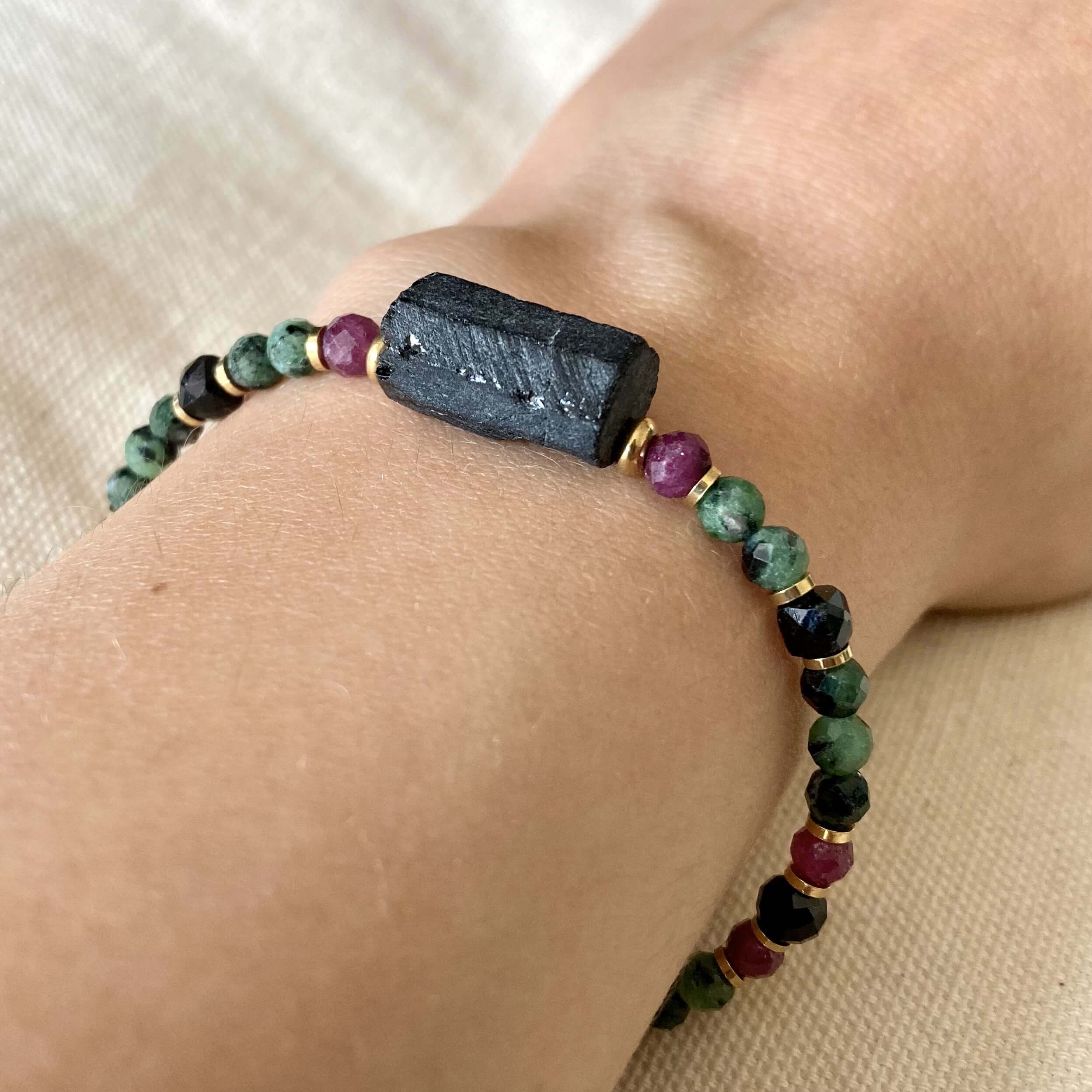 Na środku bransoletki znajduje się bryłka surowego turmalinu.