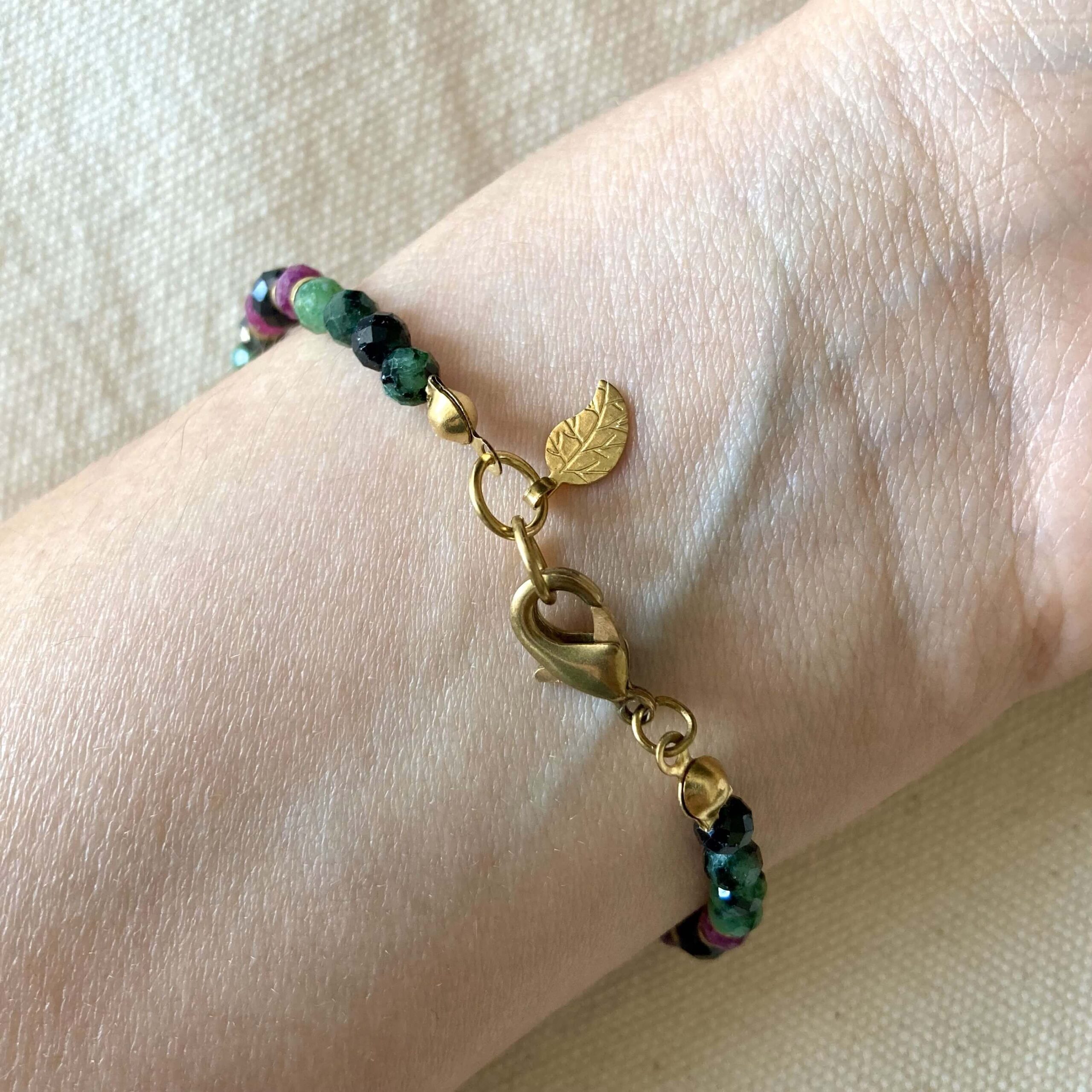 Rdzeniem bransoletki jest wytrzymała, stalowa linka jubilerska. Między kamieniami znajdują się przekładki z mosiądzu. Mosiądz jest hipoalergicznym i bezpiecznym stopem minerałów cynku oraz miedzi. Jako alternatywa dla złota, przy odpowiedniej pielęgnacji może zachować swój złoty kolor i zachwycać swoim blaskiem bez końca.