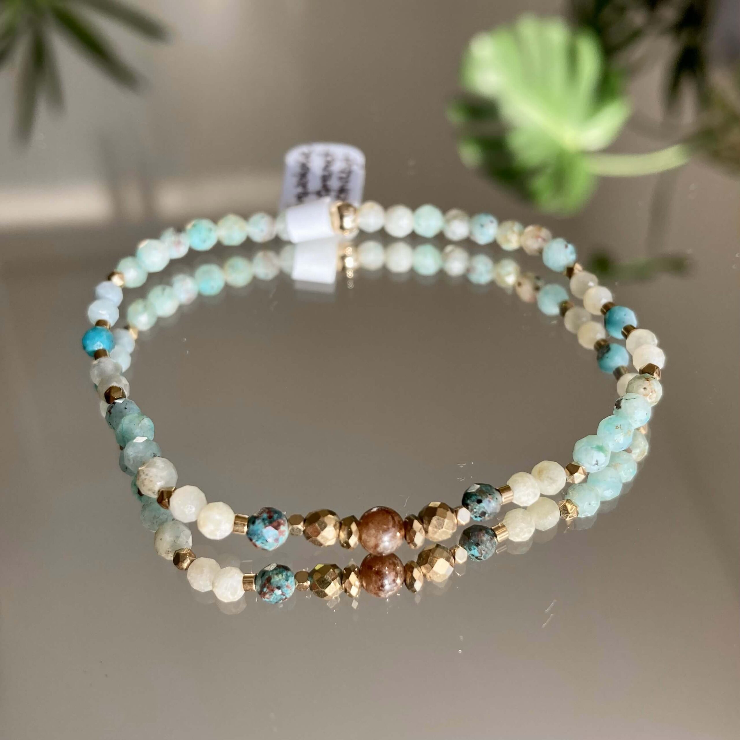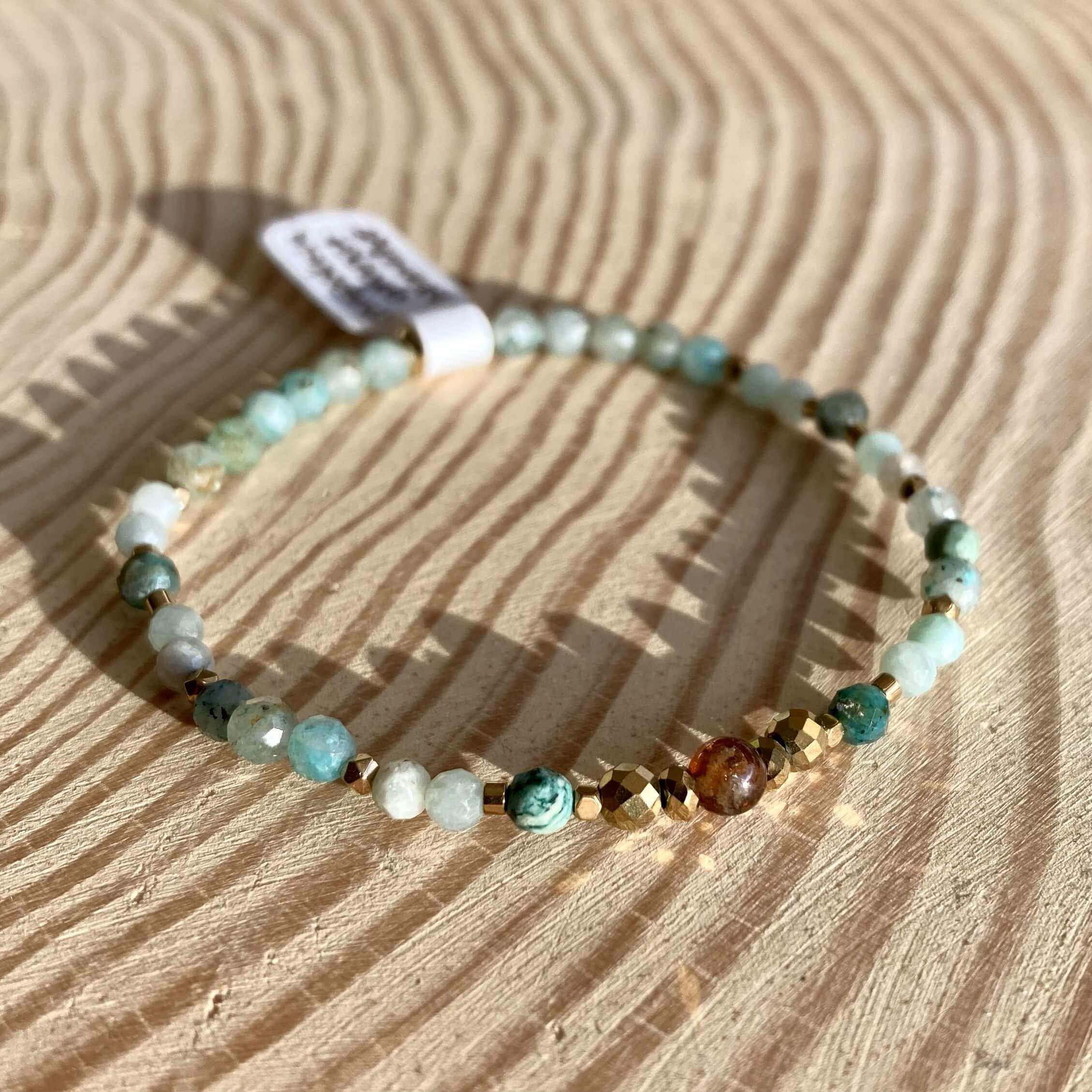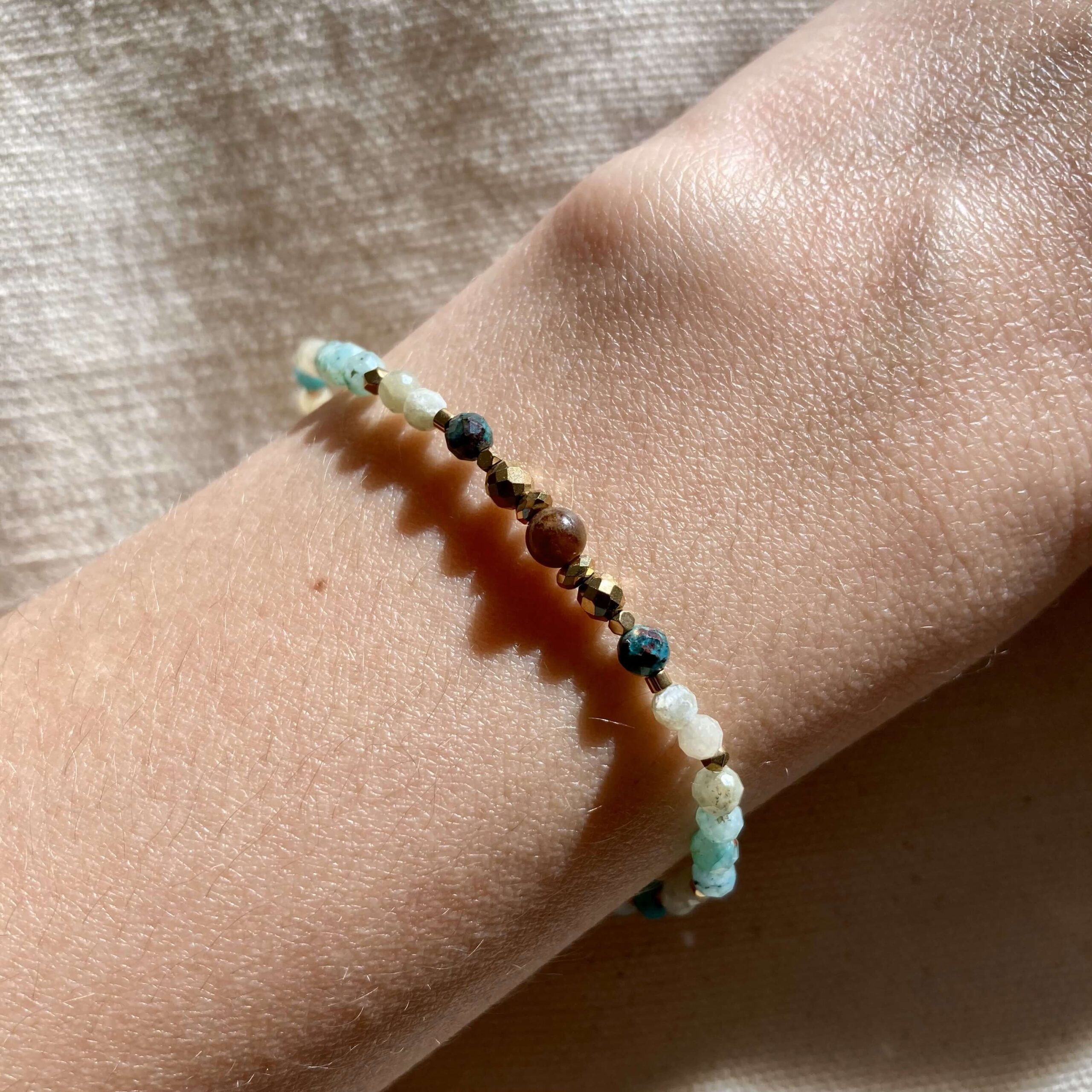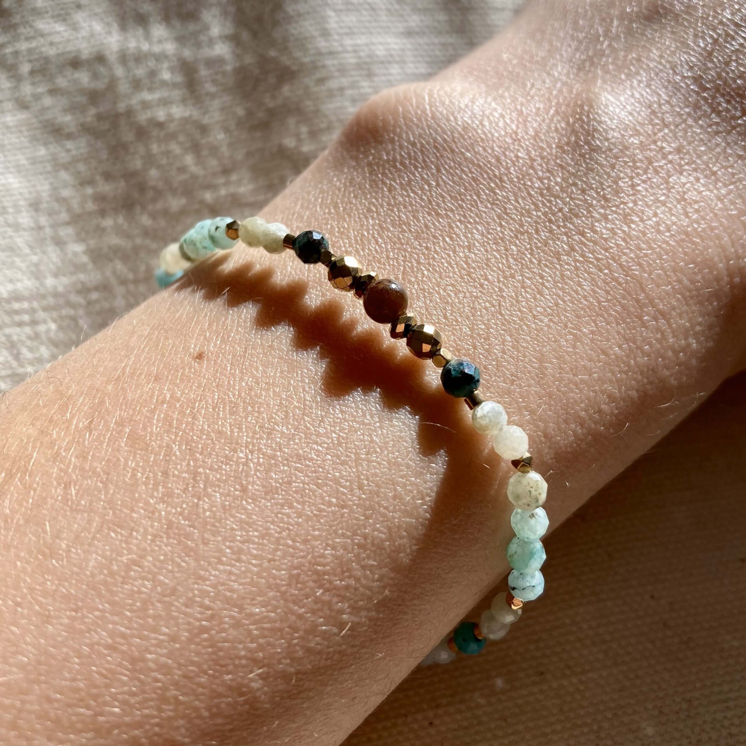 Bransoletka jest ręcznie robiona, powstała w pojedynczym, unikatowym egzemplarzu. Wykonana z naturalnych kamieni, chryzokoli, zielonego granatu i pozłacanego hematytu. Kamienie są fasetowane, co znaczy, że mają specjalny szlif dzięki, któremu pięknie odbijają światło. Bransoletka daje świetlisty i migoczący efekt.