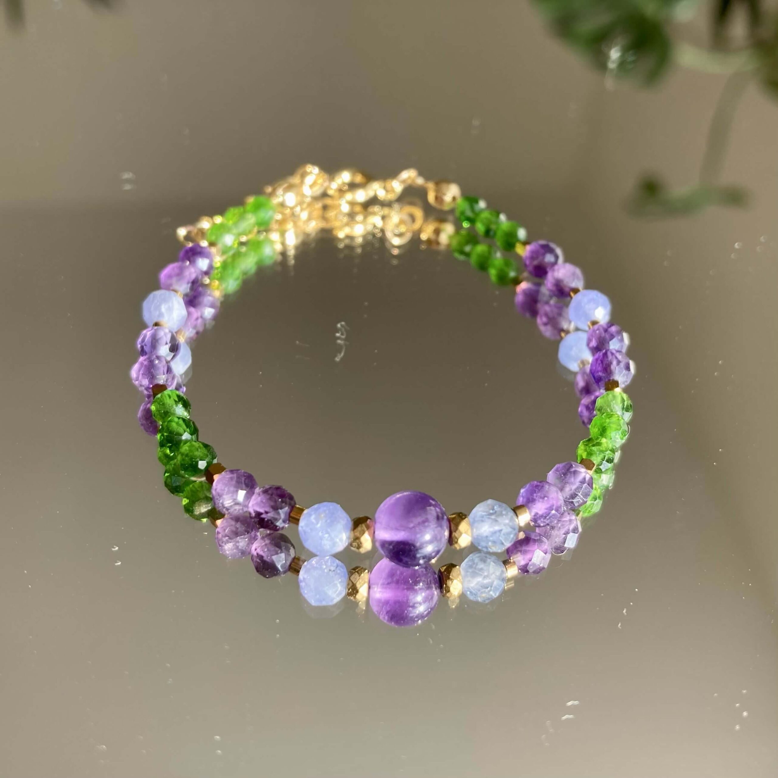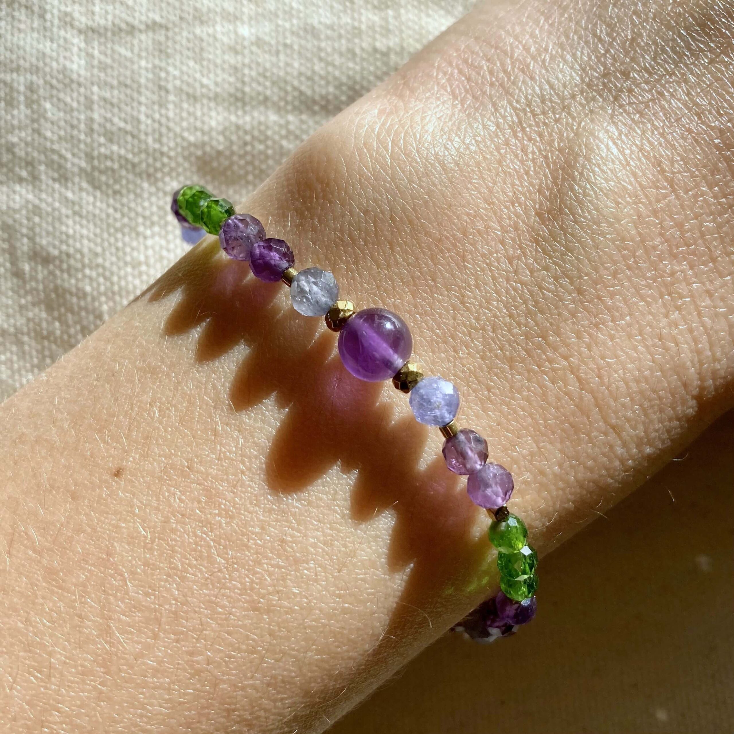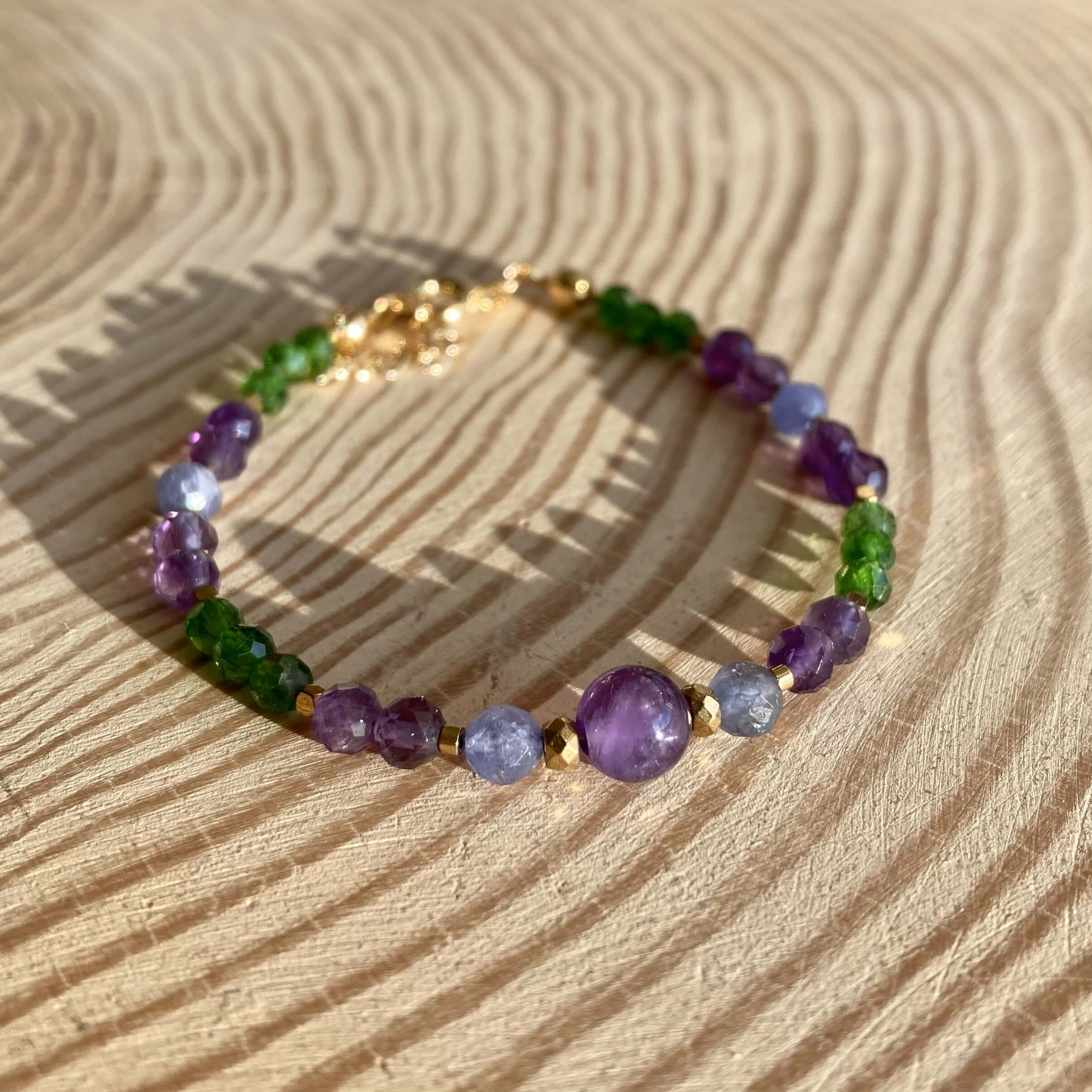 Bransoletka jest ręcznie robiona, powstała w pojedynczym, unikatowym egzemplarzu. Wykonana z naturalnych kamieni, tanzanitu, ametystu i diopsydu chromowego. Kamienie są fasetowane, co znaczy, że mają specjalny szlif dzięki, któremu pięknie odbijają światło. Bransoletka daje świetlisty i migoczący efekt.