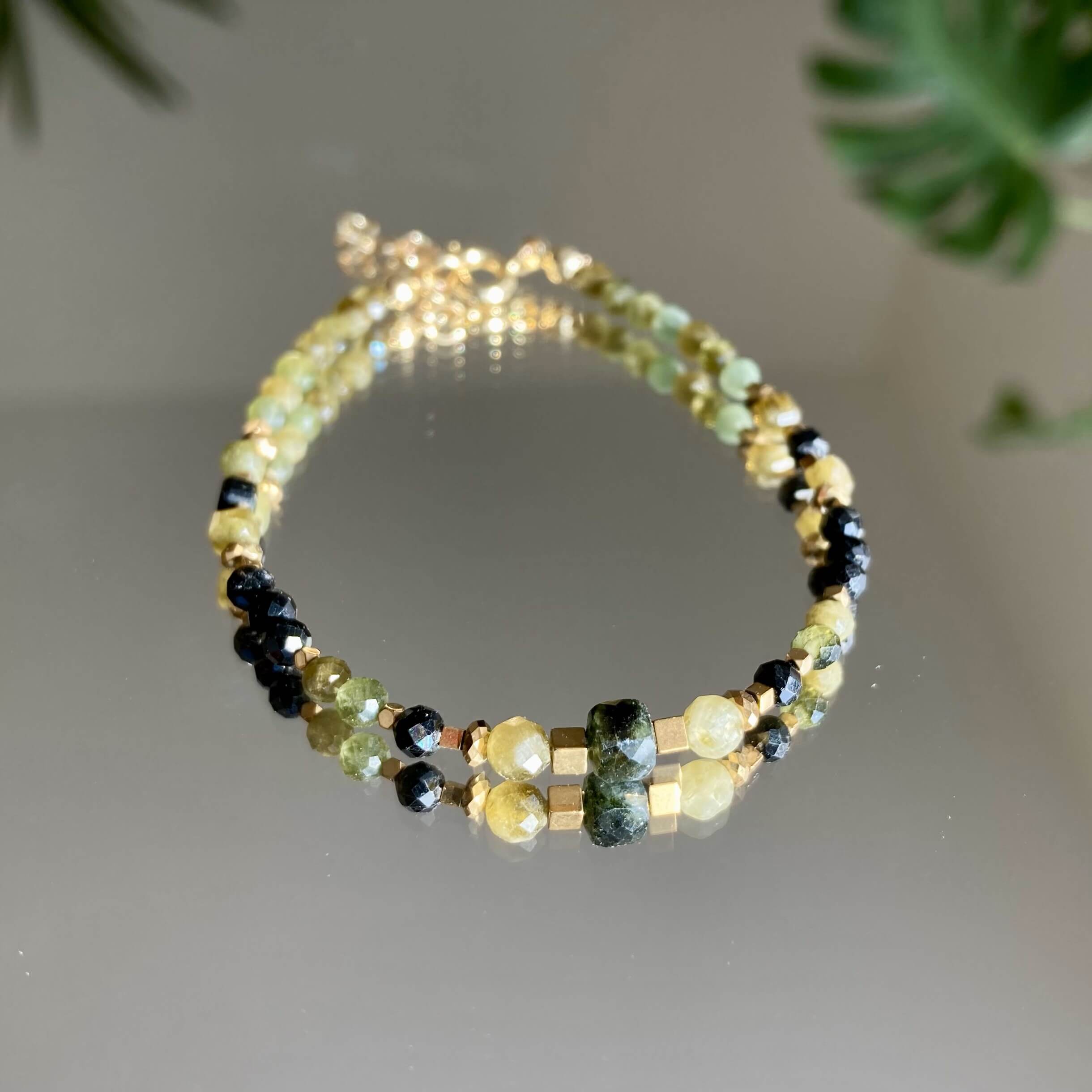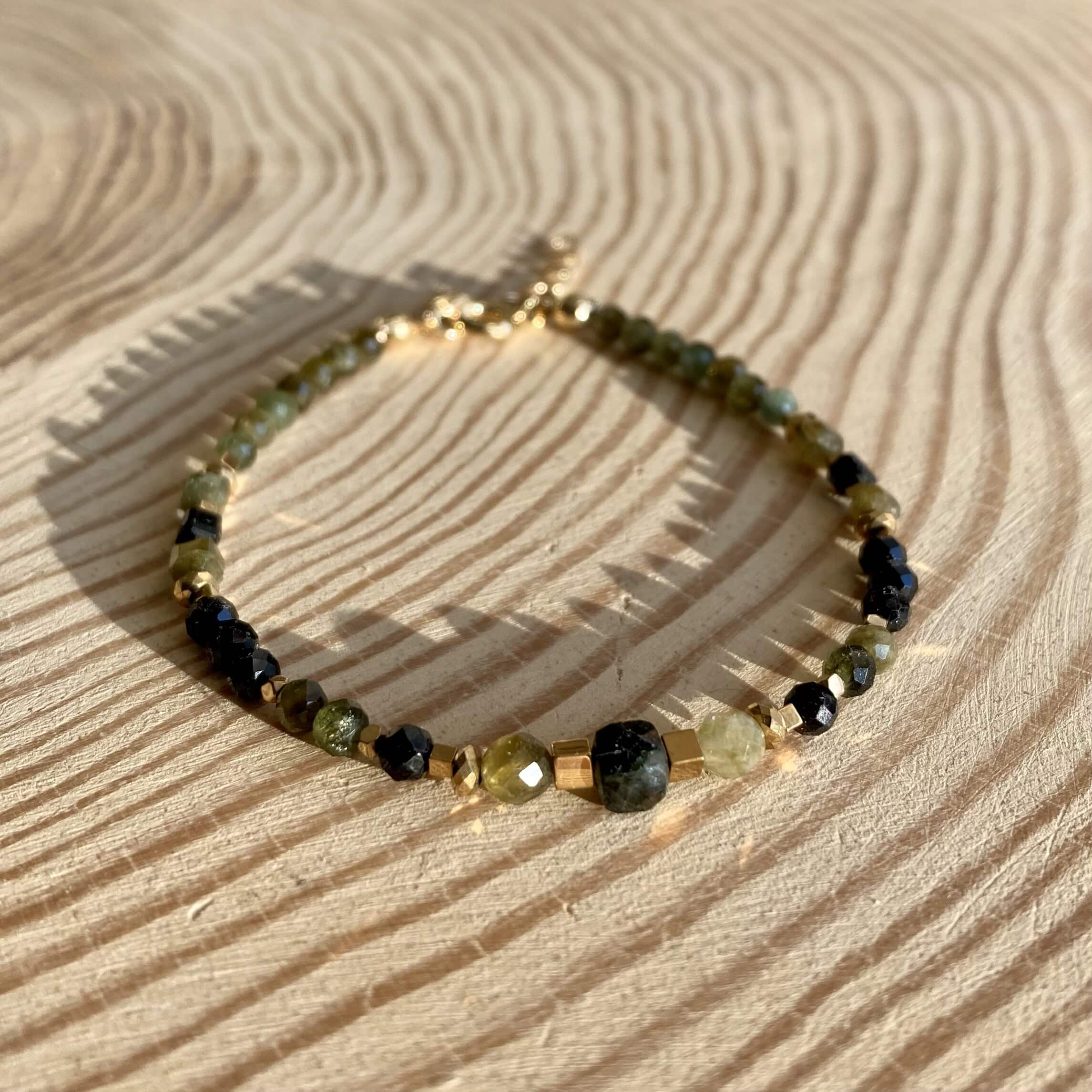 Bransoletka jest ręcznie robiona, powstała w pojedynczym, unikatowym egzemplarzu. Wykonana z naturalnych kamieni, czarnego i zielonego turmalinu. Kamienie są fasetowane, co znaczy, że mają specjalny szlif dzięki, któremu pięknie odbijają światło. Bransoletka daje świetlisty i migoczący efekt.