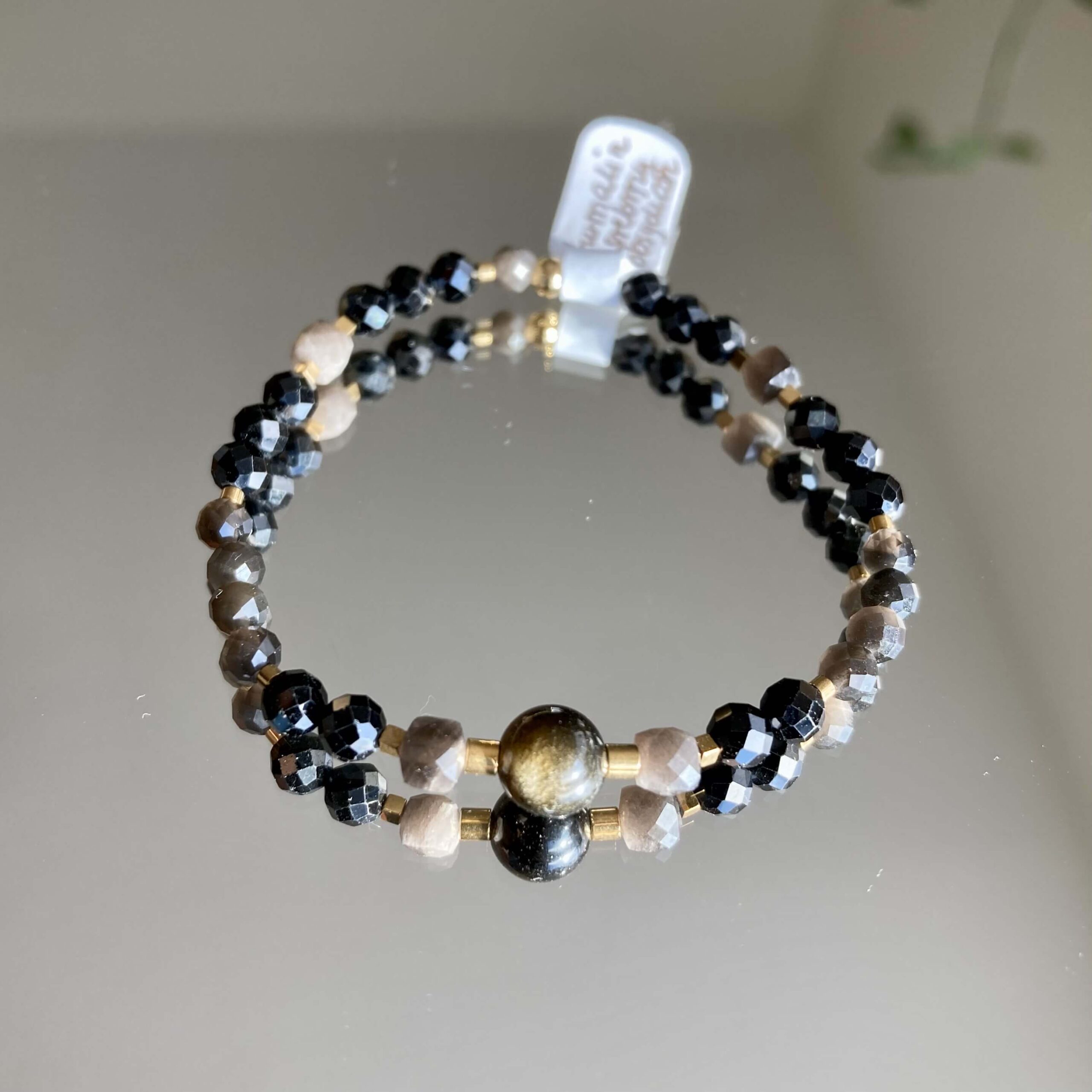 Bransoletka jest ręcznie robiona, powstała w pojedynczym, unikatowym egzemplarzu. Wykonana z naturalnych kamieni, czarnego turmalinu oraz srebrnego i złotego obsydianu. Srebrny obsydian wyróżnia się zjawiskiem występującej w nim opalizacji, co znaczy, że połyskuje srebrzyście w świetle. Kamienie są fasetowane, co znaczy, że mają specjalny szlif dzięki, któremu pięknie odbijają światło. Bransoletka daje świetlisty i migoczący efekt.