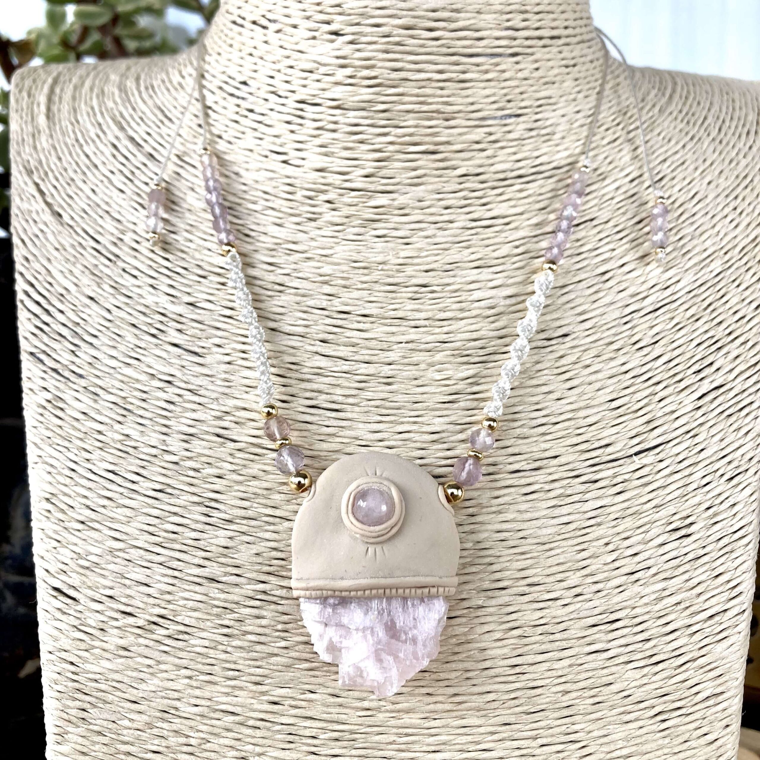 Naszyjnik w formie amuletu mocy z surowym kunzytem i kwarcem różowym.