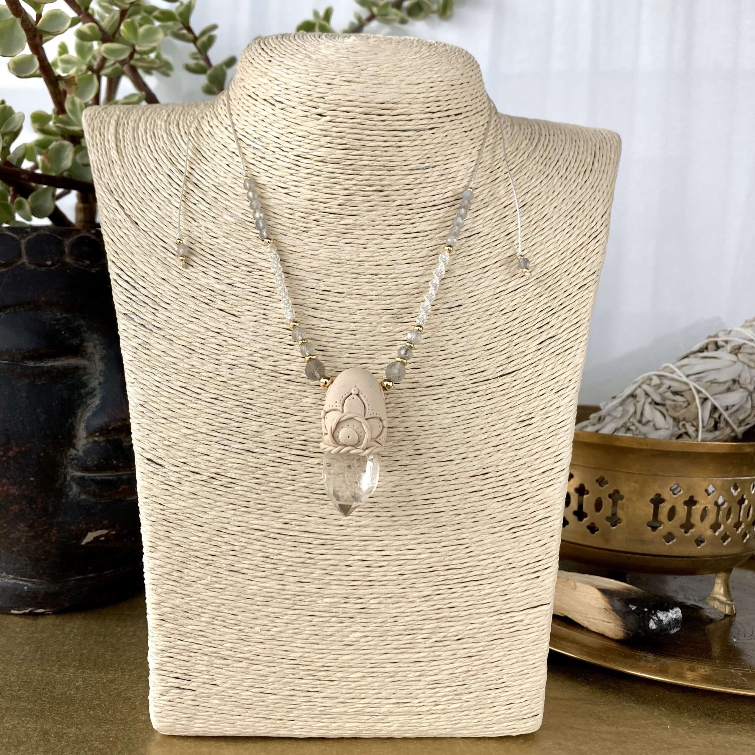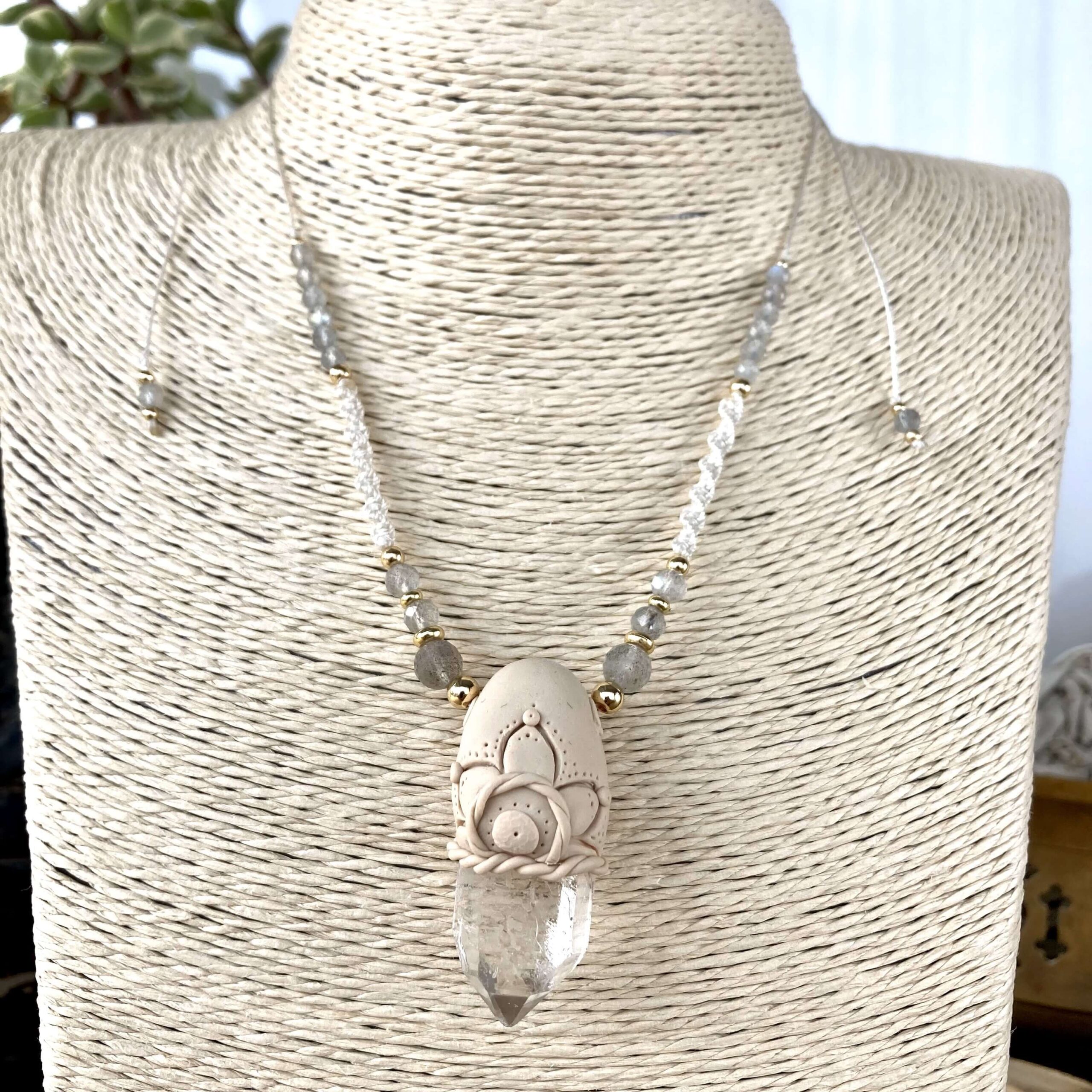 - autorski projekt – kamień osadzony w masie plastycznej, to dość długi proces tworzenia w trakcie którego wyrabiam własnoręcznie masę, rzeźbię w niej, a na końcu wypalam, by w efekcie uzyskać ten niepowtarzalny naszyjnik,