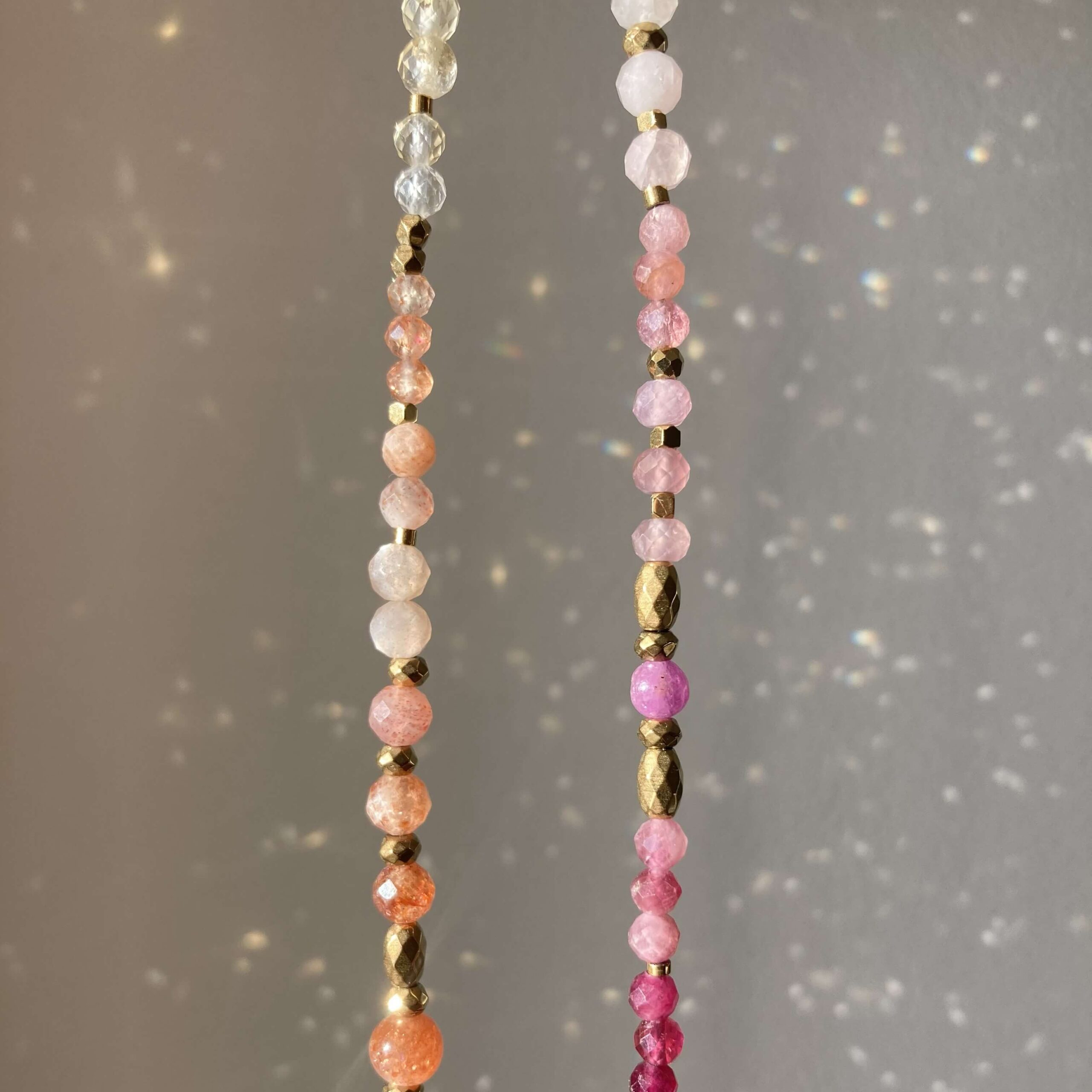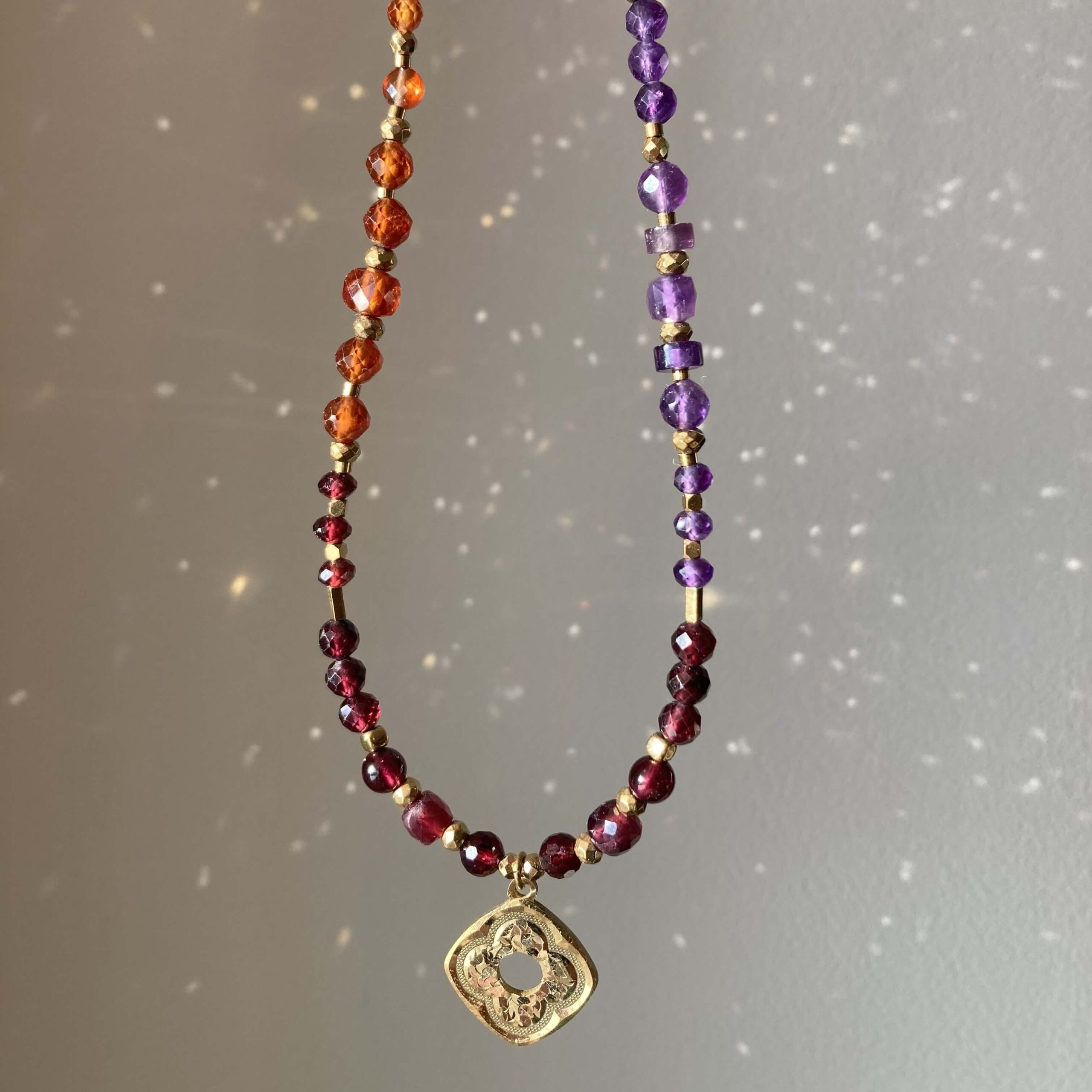 Ten kolorowy naszyjnik powstał własnoręcznie w pojedynczym, unikatowym egzemplarzu. Został wykonany z naturalnych kamieni: granatu, spessartynu, kamienia słonecznego, cytrynu, żółtego opalu, różowego turmalinu, kwarcu różowego, rubinu oraz ametystu. To bogate połączenie kamieni zostało ułożone w gradientowym wzorze, przejściu kamieni przez ich różne kolory – od delikatnych, cytrynowo-żółtych odcieni, przez brzoskwiniowe i pomarańczowe, intensywne bordo, fiolet, po żywe i subtelne, pastelowe róże. Kamienie są fasetowane, co znaczy, że mają specjalny szlif dzięki, któremu pięknie odbijają światło. Naszyjnik daje świetlisty i migoczący efekt, który doda Tobie aurę pełną światła i blasku.