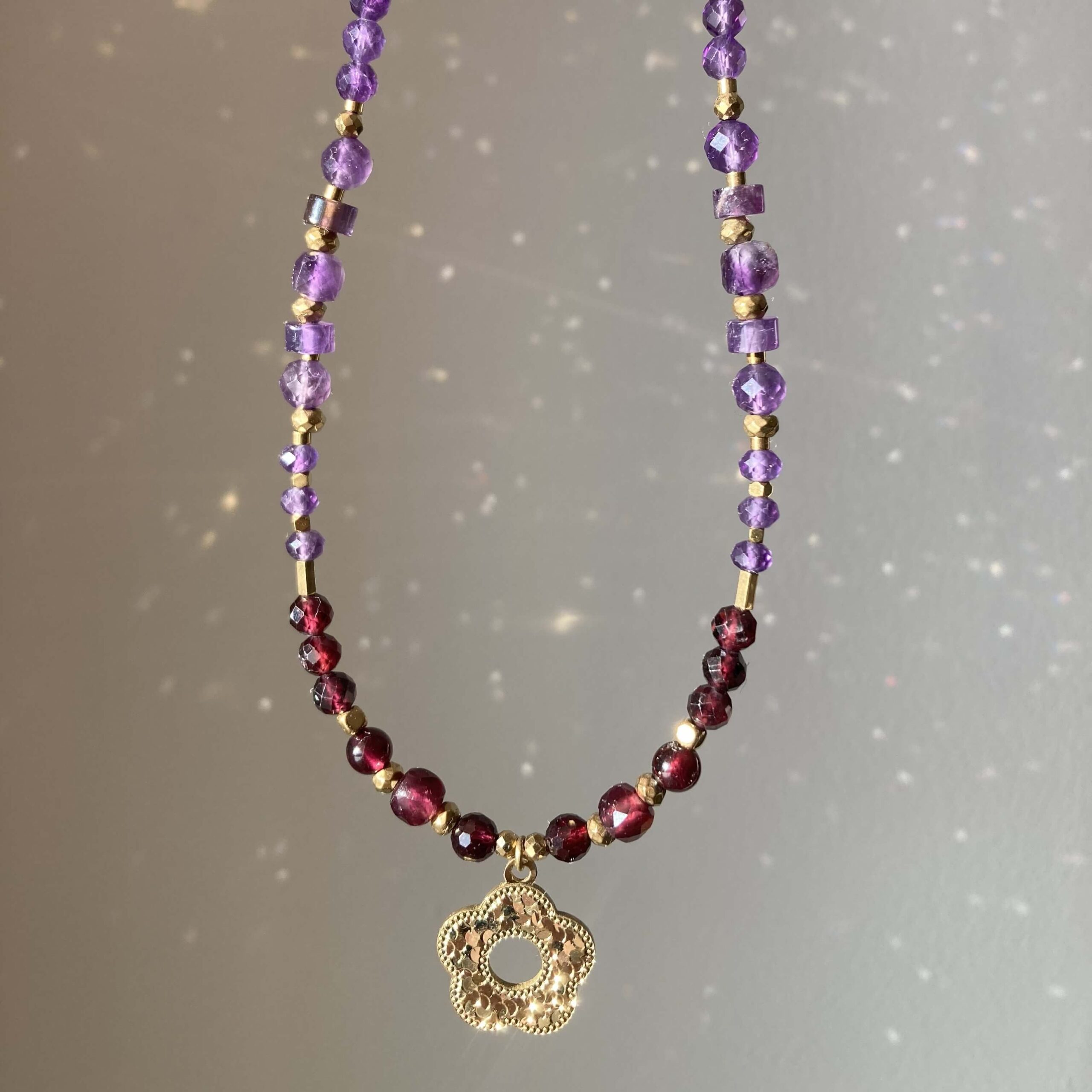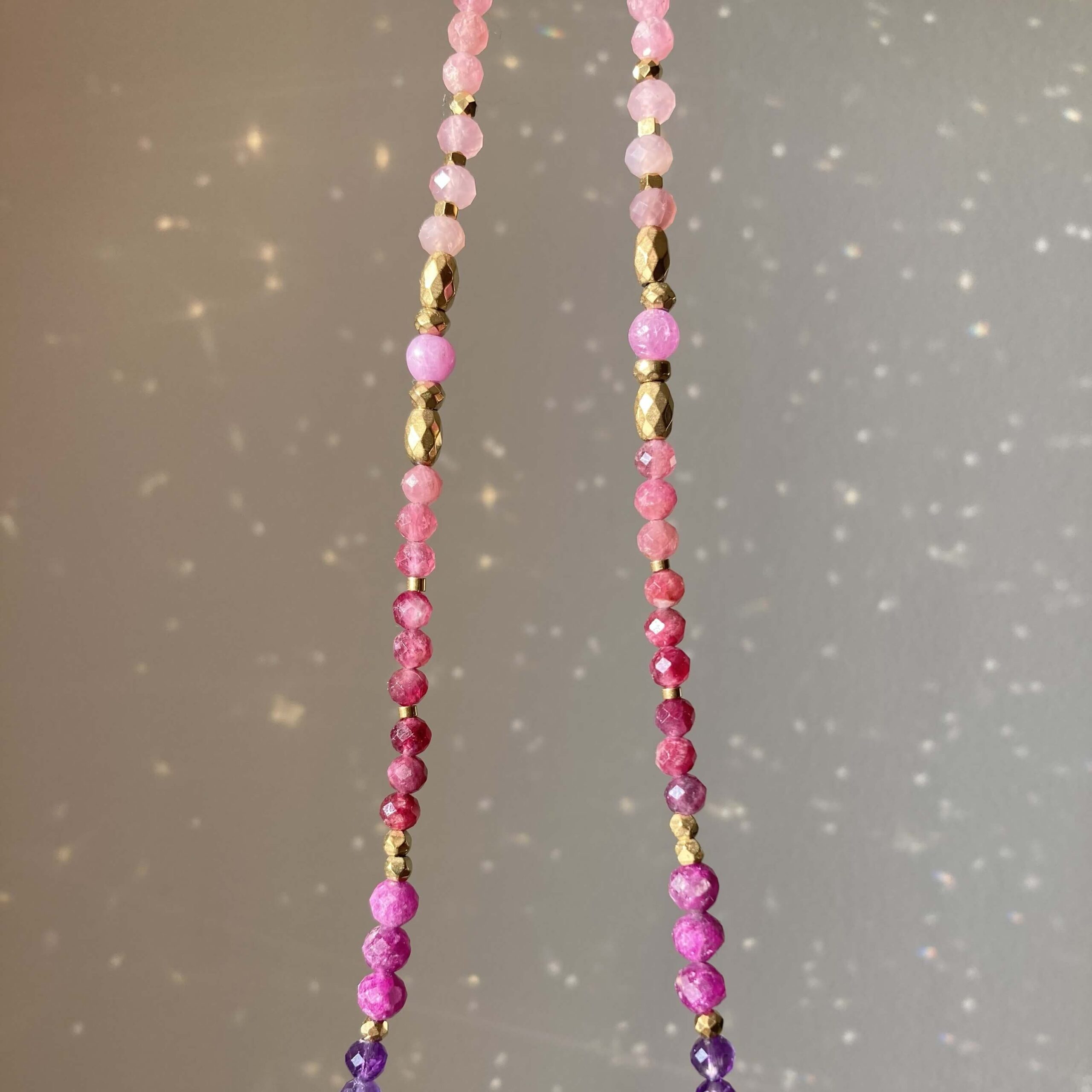 Ten kolorowy naszyjnik powstał własnoręcznie w pojedynczym, unikatowym egzemplarzu. Został wykonany z naturalnych kamieni: różowego turmalinu, kwarcu różowego, kunzytu, rubinu, granatu oraz ametystu. To bogate połączenie kamieni zostało ułożone w gradientowym wzorze, przejściu kamieni przez ich różne kolory – od delikatnych, cytrynowo-żółtych odcieni, przez brzoskwiniowe i pomarańczowe, intensywne bordo, fiolet, po żywe i subtelne, pastelowe róże. Kamienie są fasetowane, co znaczy, że mają specjalny szlif dzięki, któremu pięknie odbijają światło. Naszyjnik daje świetlisty i migoczący efekt, który doda Tobie aurę pełną światła i blasku.