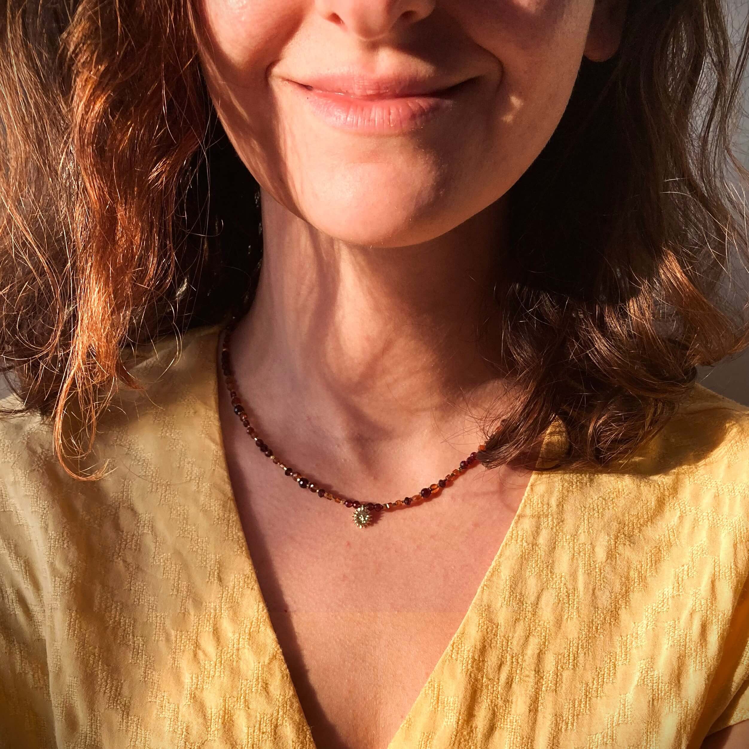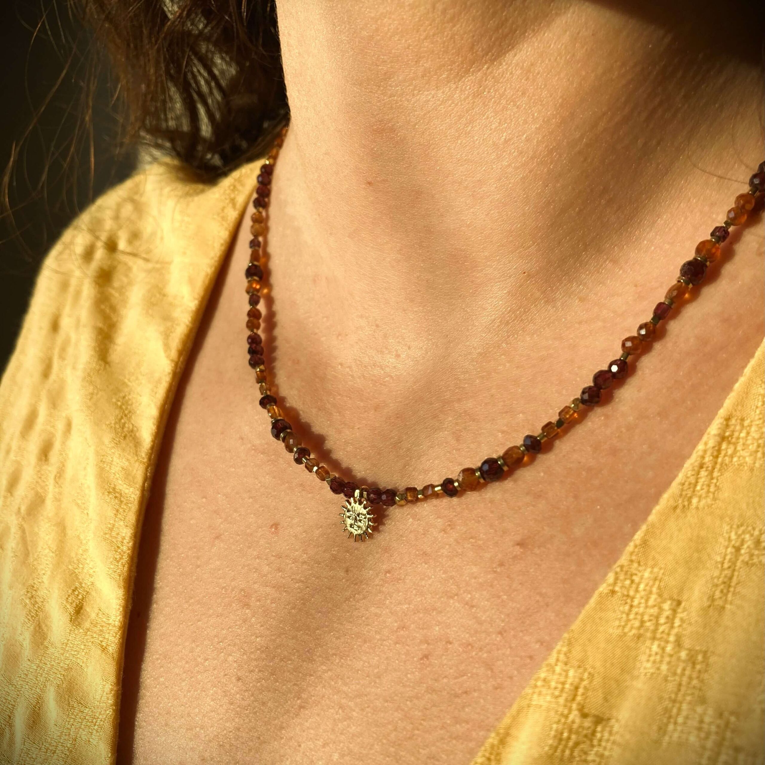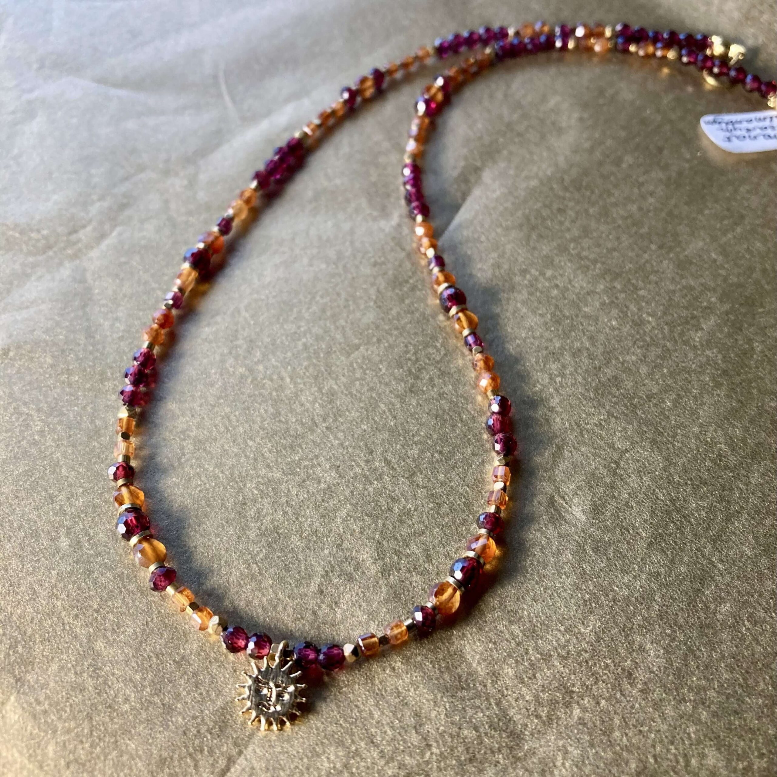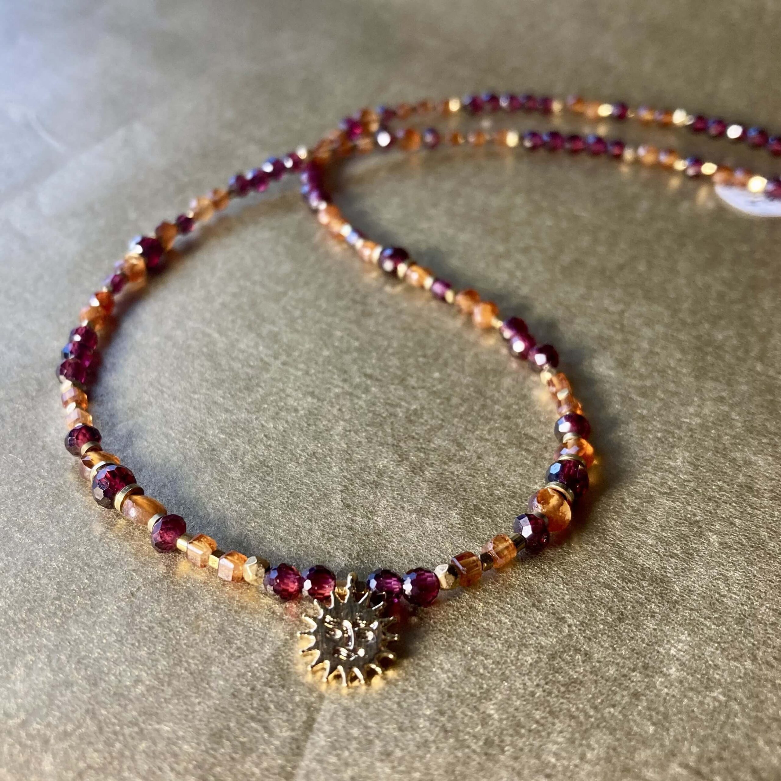 Naszyjnik jest ręcznie robiony, powstał w pojedynczym, unikatowym egzemplarzu. Wykonany z naturalnych kamieni, granatów – klasycznego w kolorze bordo oraz pomarańczowego nazywanego też spessartynem. Kamienie są fasetowane, co znaczy, że mają specjalny szlif dzięki, któremu pięknie odbijają światło. Naszyjnik daje świetlisty i migoczący efekt.