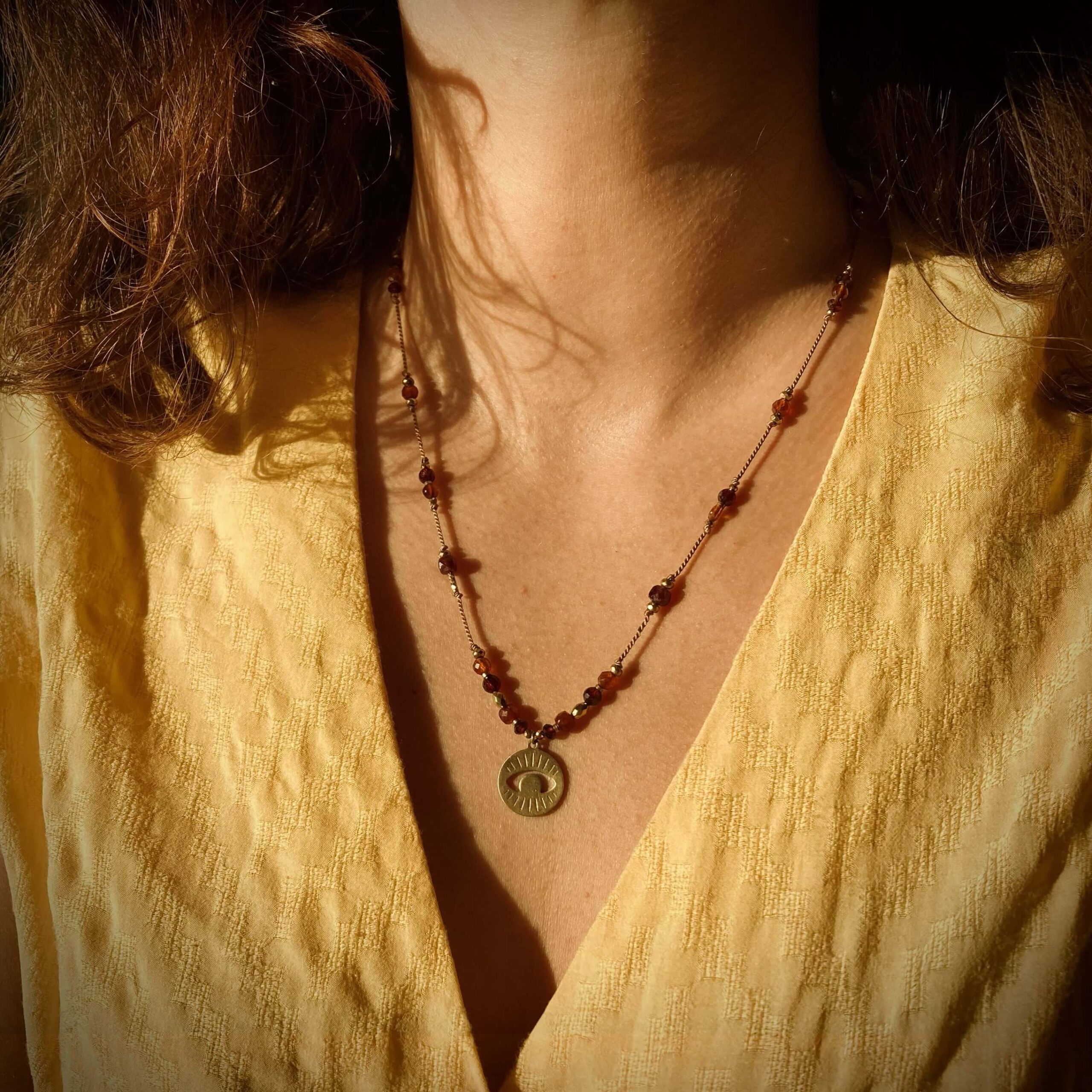 Naszyjnik niesie intencję pracy z żywiołem ognia, czyli transformacją mocą doświadczania, poczuciem pewności siebie i odwagi oraz wzmocnienia energii życiowej. Tym jak niedobór tego żywiołu manifestuje się w nas i naszym życiu przeczytasz poniżej.