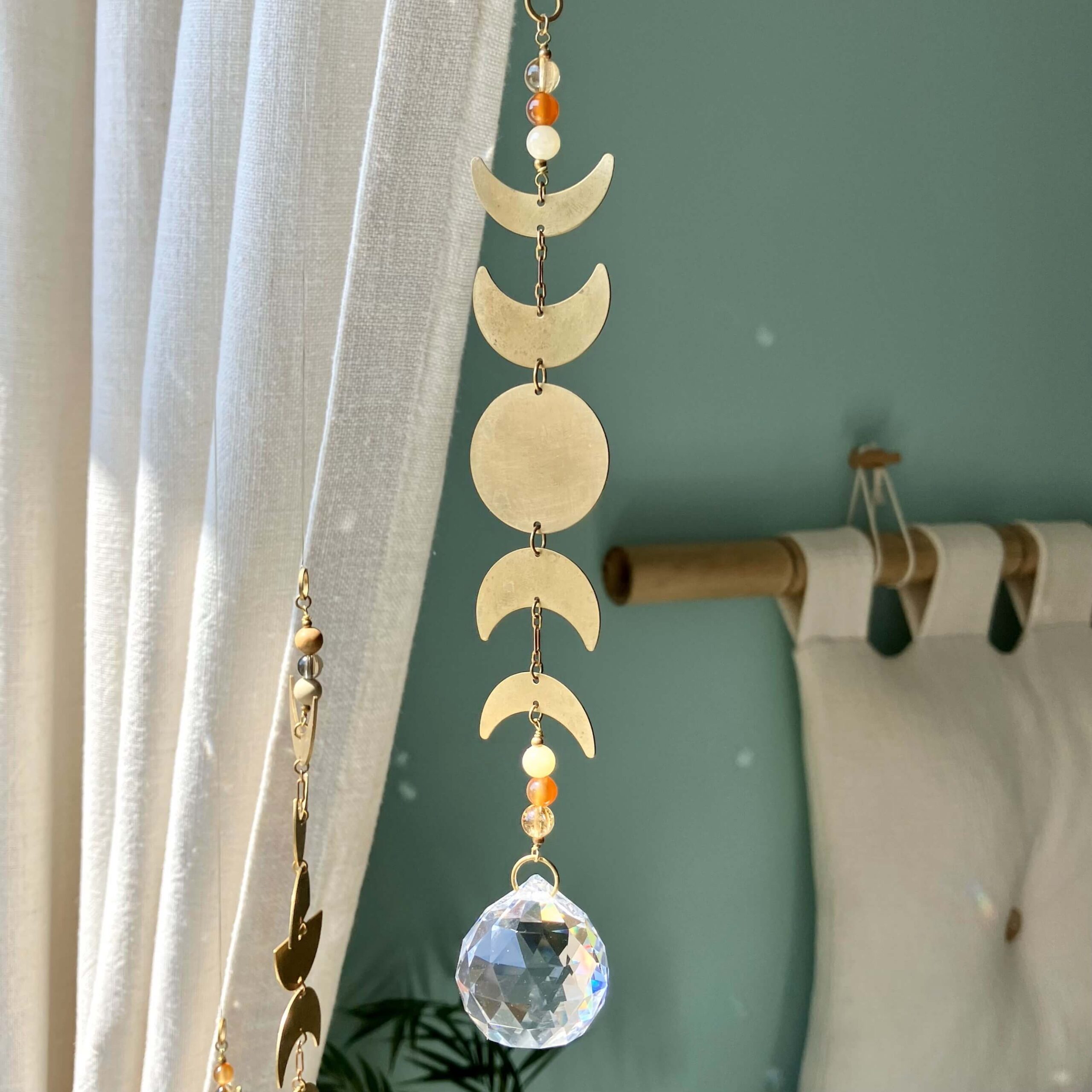 Łapacz słońca wykonany własnoręcznie ze szlachetnego mosiądzu i kryształów. Kryształy są fasetowane, co znaczy, że mają specjalny szlif dzięki, któremu pięknie odbijają światło i jednocześnie działają jak pryzmat rozpraszając światło słoneczne.