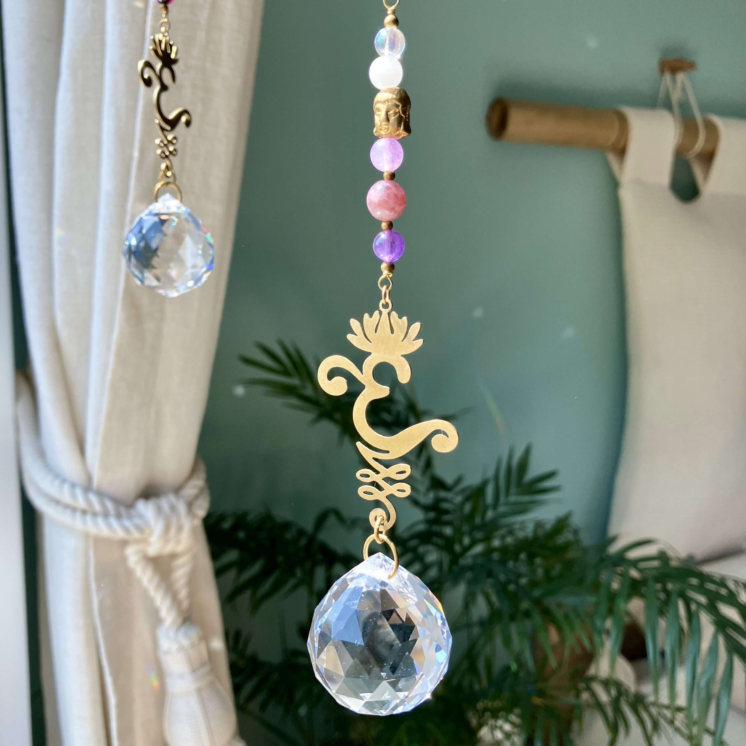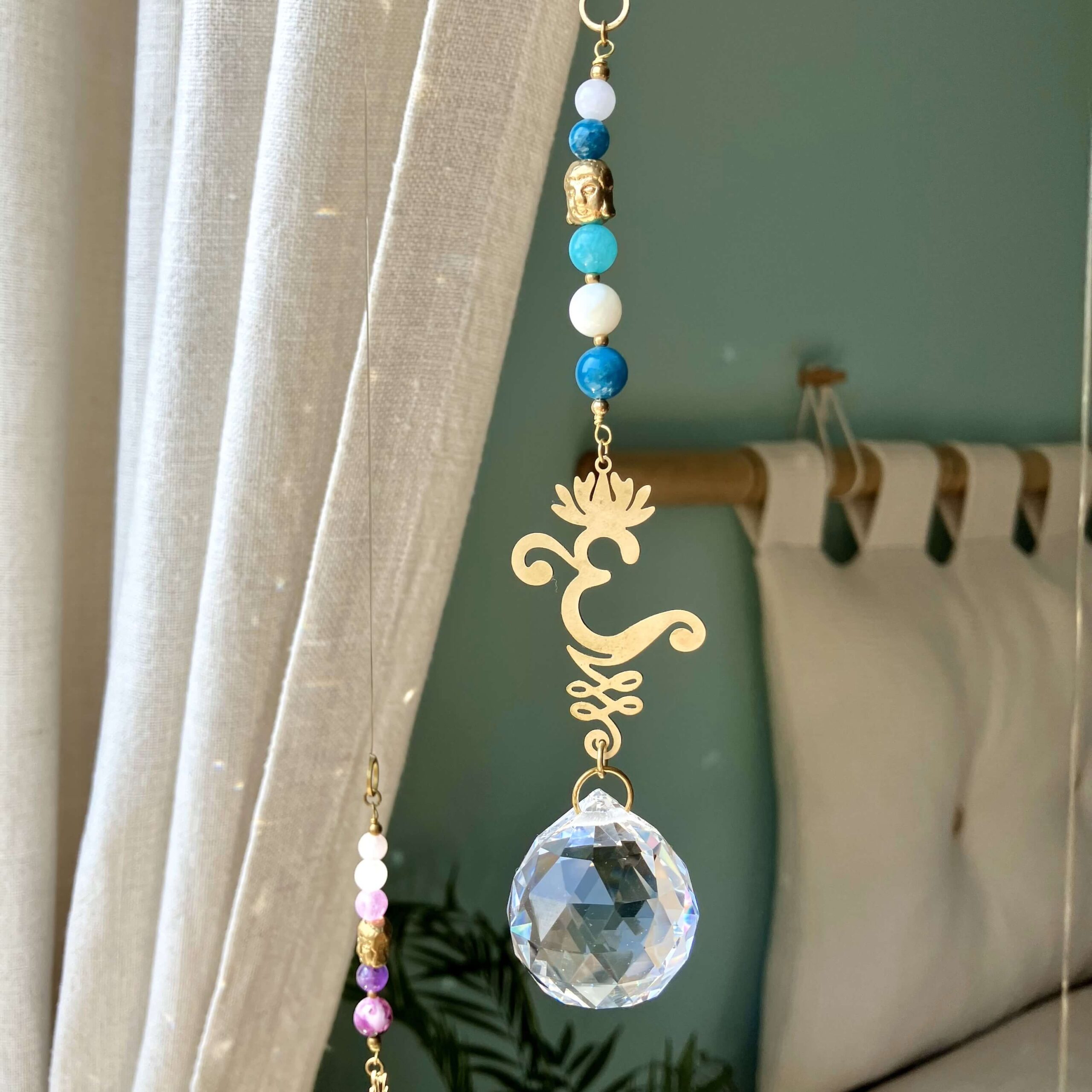 Łapacz słońca wykonany własnoręcznie ze szlachetnego mosiądzu, kryształów i naturalnego kamienia. Kryształy są fasetowane, co znaczy, że mają specjalny szlif dzięki, któremu pięknie odbijają światło oraz działają jak pryzmat rozpraszając światło słoneczne.
