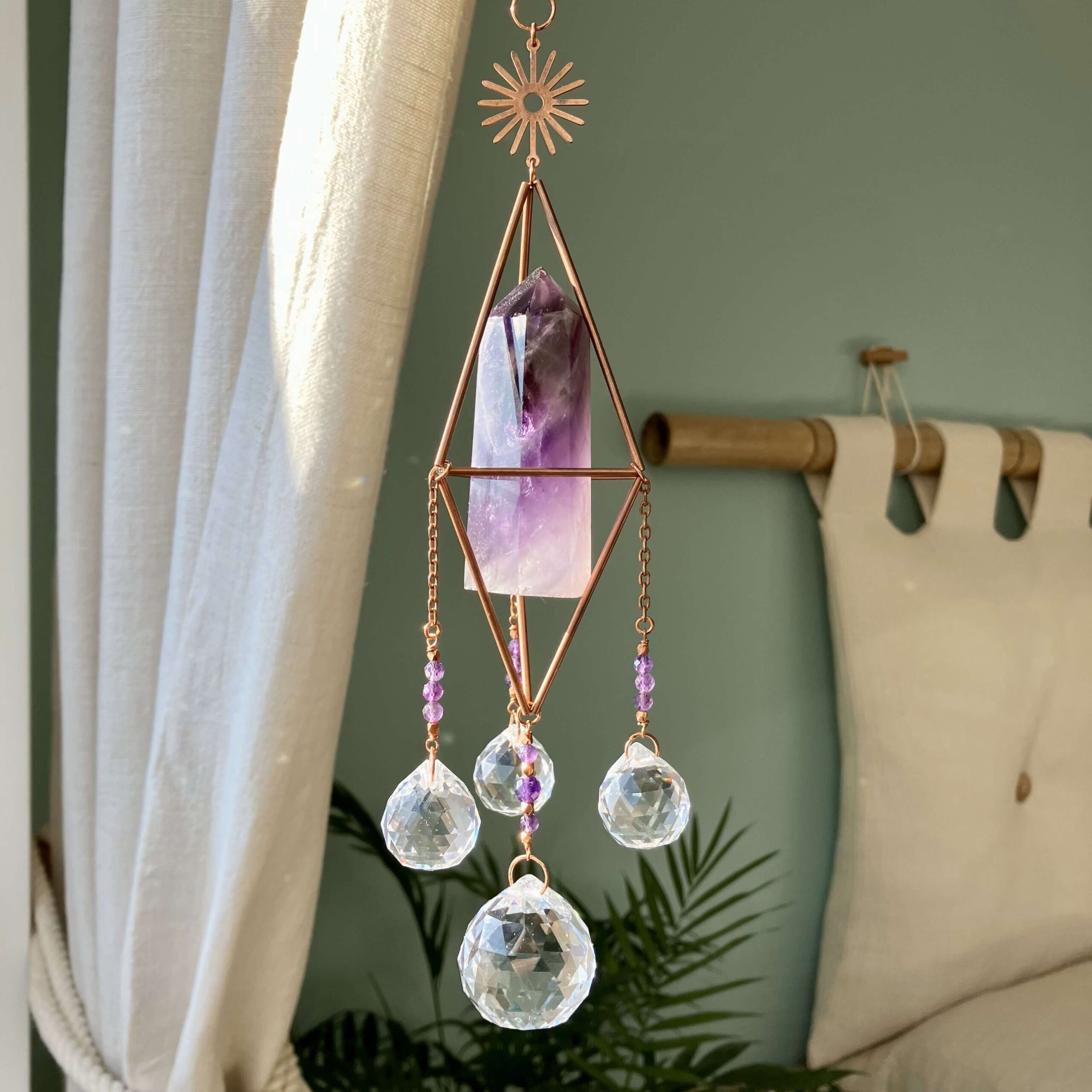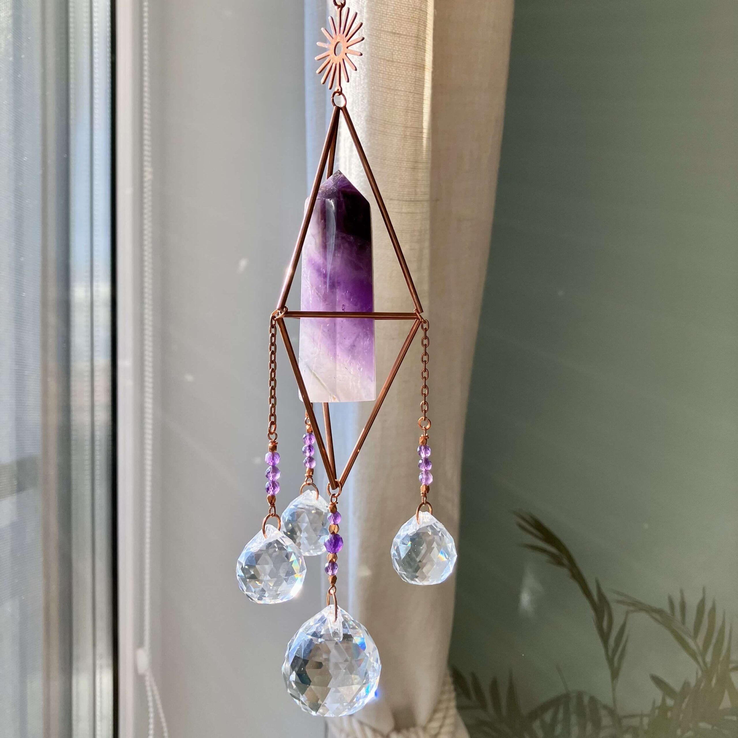 Łapacz słońca powstał w unikatowym, pojedynczym egzemplarzu. Wykonany własnoręcznie ze szlachetnej miedzi, kryształów i naturalnego kamienia ametystu. Kamienie i kryształy są fasetowane, co znaczy, że mają specjalny szlif dzięki, któremu pięknie odbijają światło.