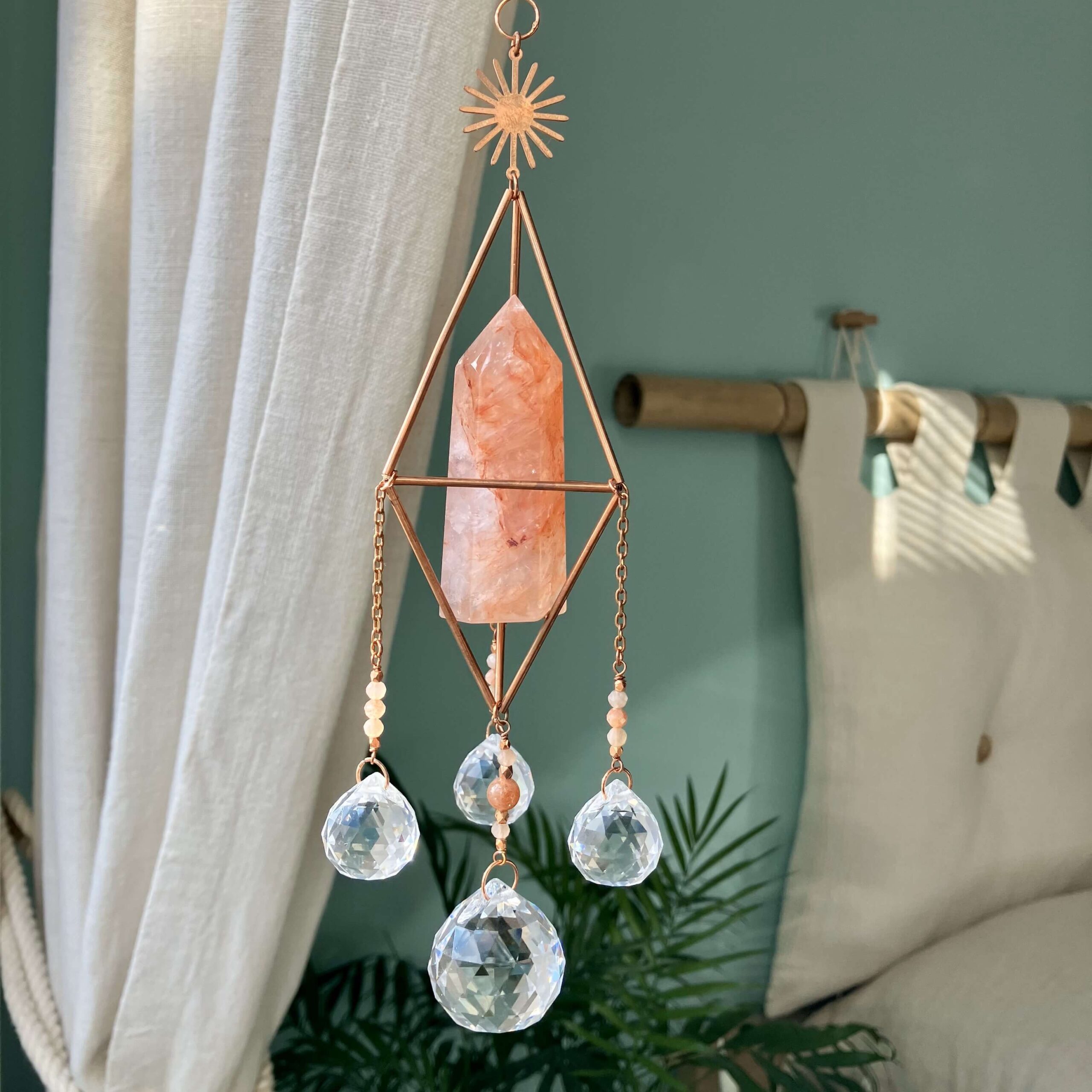 Może nam w tym pomóc łapacz słońca z kryształem, który zawiesza się w miejscu z bezpośrednim nasłonecznieniem. Kryształ będący pryzmatem rozprasza wtedy padające na niego światło słoneczne, tworząc kolorowe punkty świetlne. Stając się nośnikiem iluminacji słońca rozświetla wnętrze, a szczególnie te miejsca, do których nie docierają bezpośrednie promienie słoneczne. Otula naszą przestrzeń kolorową promiennością, zapewniając przy tym magicznie kolorowy pokaz świetlny. Ma przypominać nam o tym, że czasem warto zatrzymać się na moment w tu i teraz – zawiesić oko na słonecznym tańcu i pozwolić myślom odpłynąć..