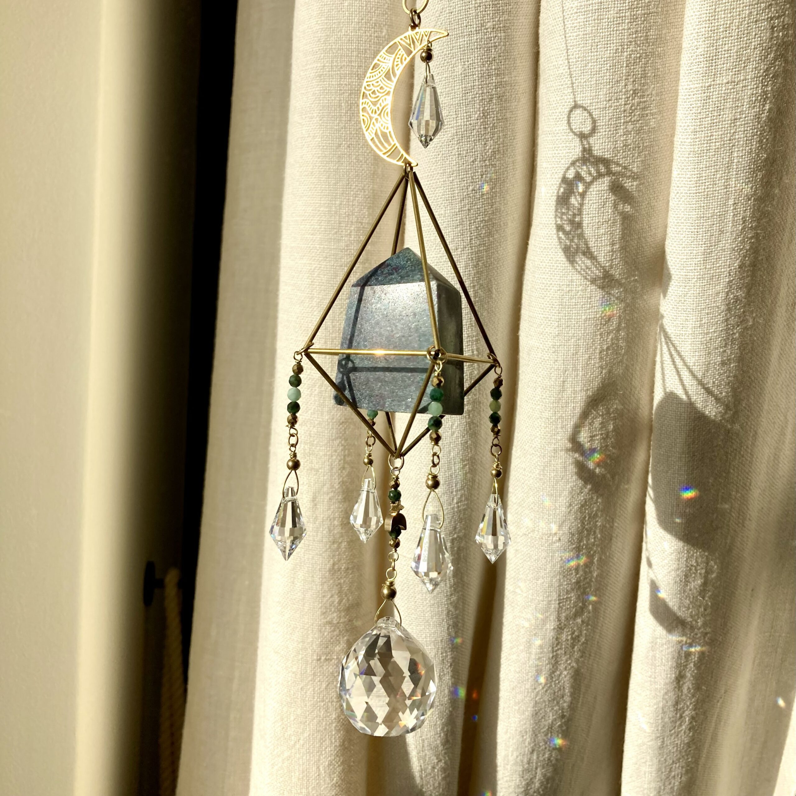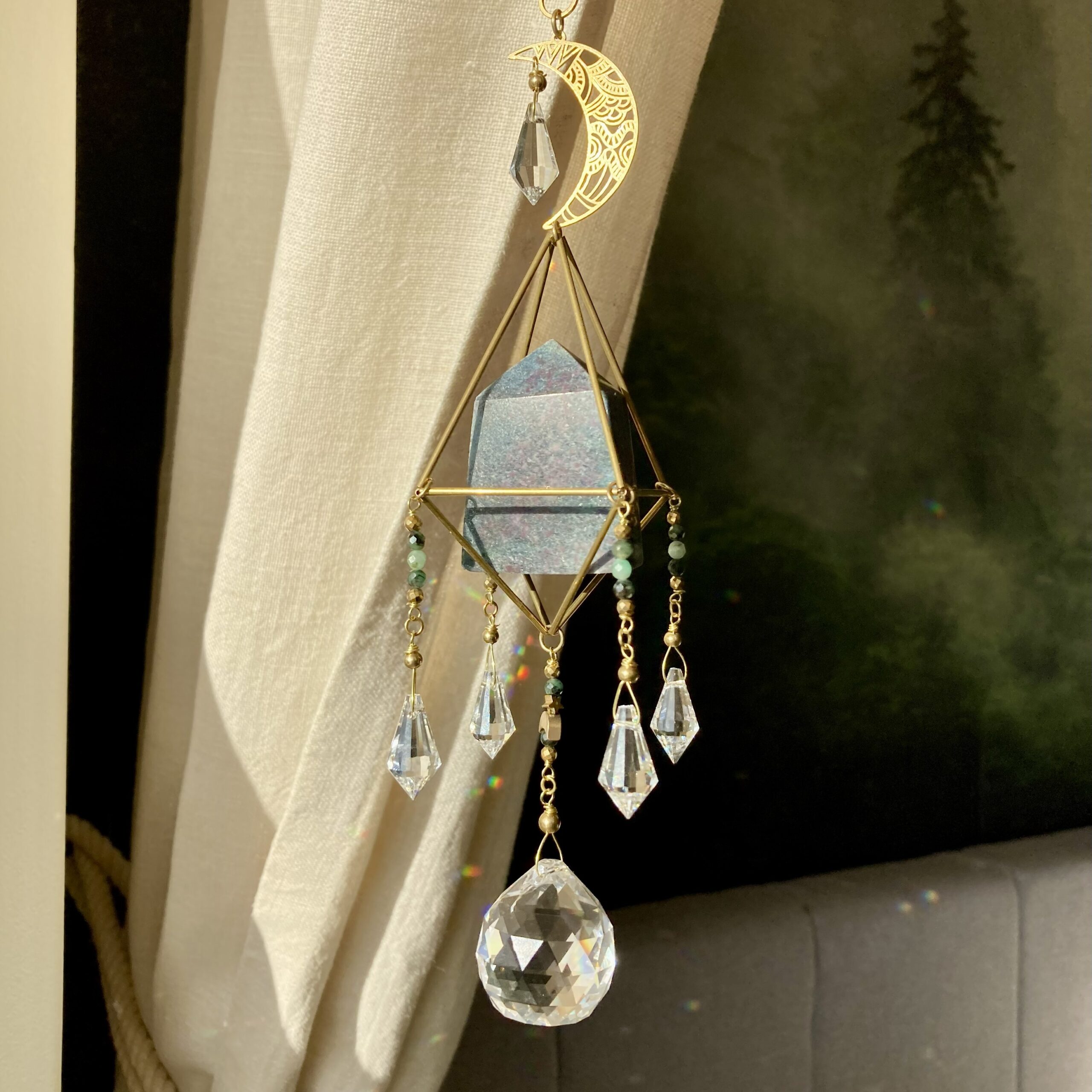 Może nam w tym pomóc łapacz słońca z kryształem, który zawiesza się w miejscu z bezpośrednim nasłonecznieniem. Kryształ będący pryzmatem rozprasza wtedy padające na niego światło słoneczne, tworząc kolorowe punkty świetlne. Stając się nośnikiem iluminacji słońca rozświetla wnętrze, a szczególnie te miejsca, do których nie docierają bezpośrednie promienie słoneczne. Otula naszą przestrzeń kolorową promiennością, zapewniając przy tym magicznie kolorowy pokaz świetlny. Ma przypominać nam o tym, że czasem warto zatrzymać się na moment w tu i teraz – zawiesić oko na słonecznym tańcu i pozwolić myślom odpłynąć..