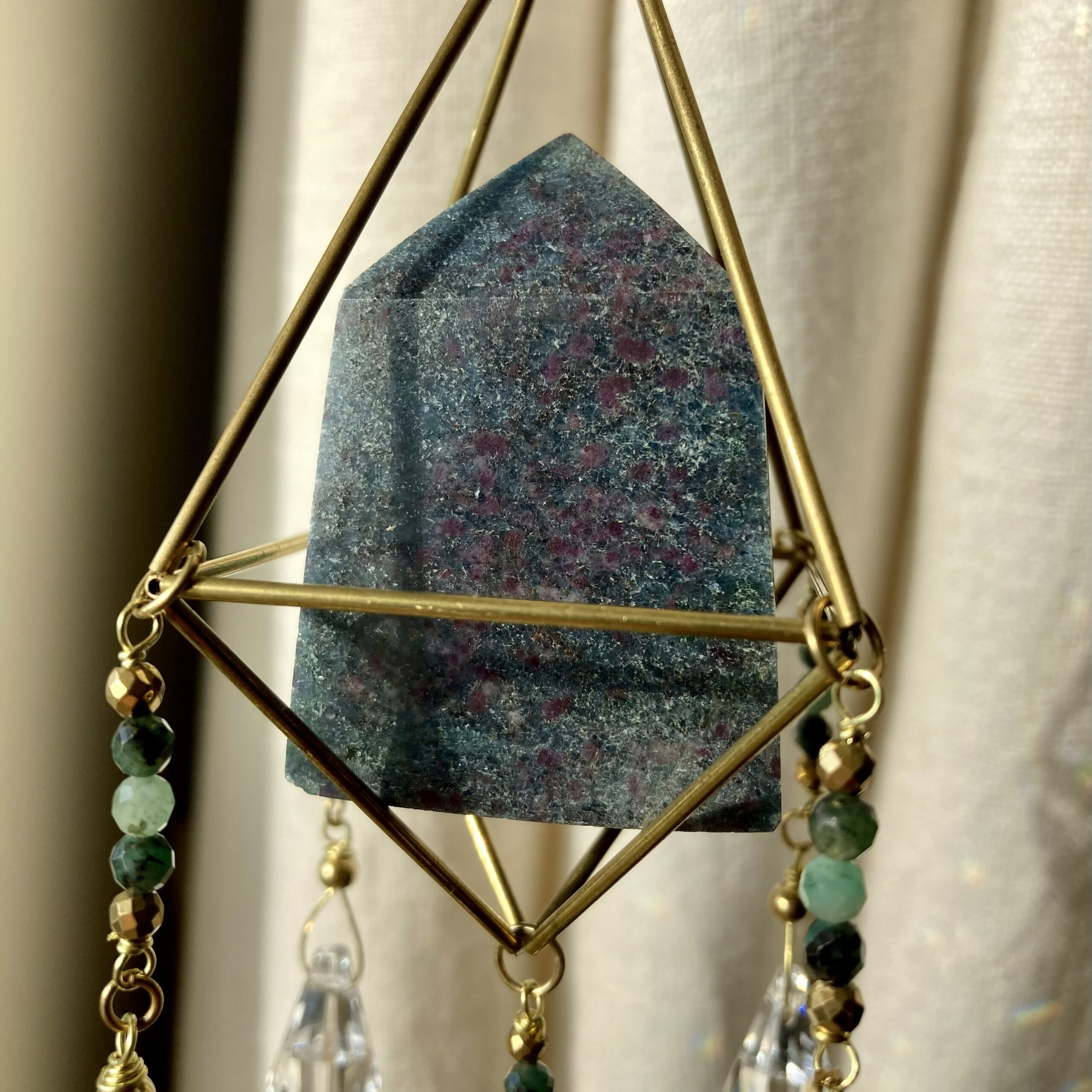Łapacz słońca powstał w unikatowym, pojedynczym egzemplarzu. Wykonany własnoręcznie ze szlachetnego mosiądzu, kryształów i naturalnego kamienia rubinowego kyanitu. Kamień jest niesamowitym połączeniem kilku minerałów takich jak kyanit, rubin oraz fuschyt, który ma bardzo ciekawy, zielony połysk.