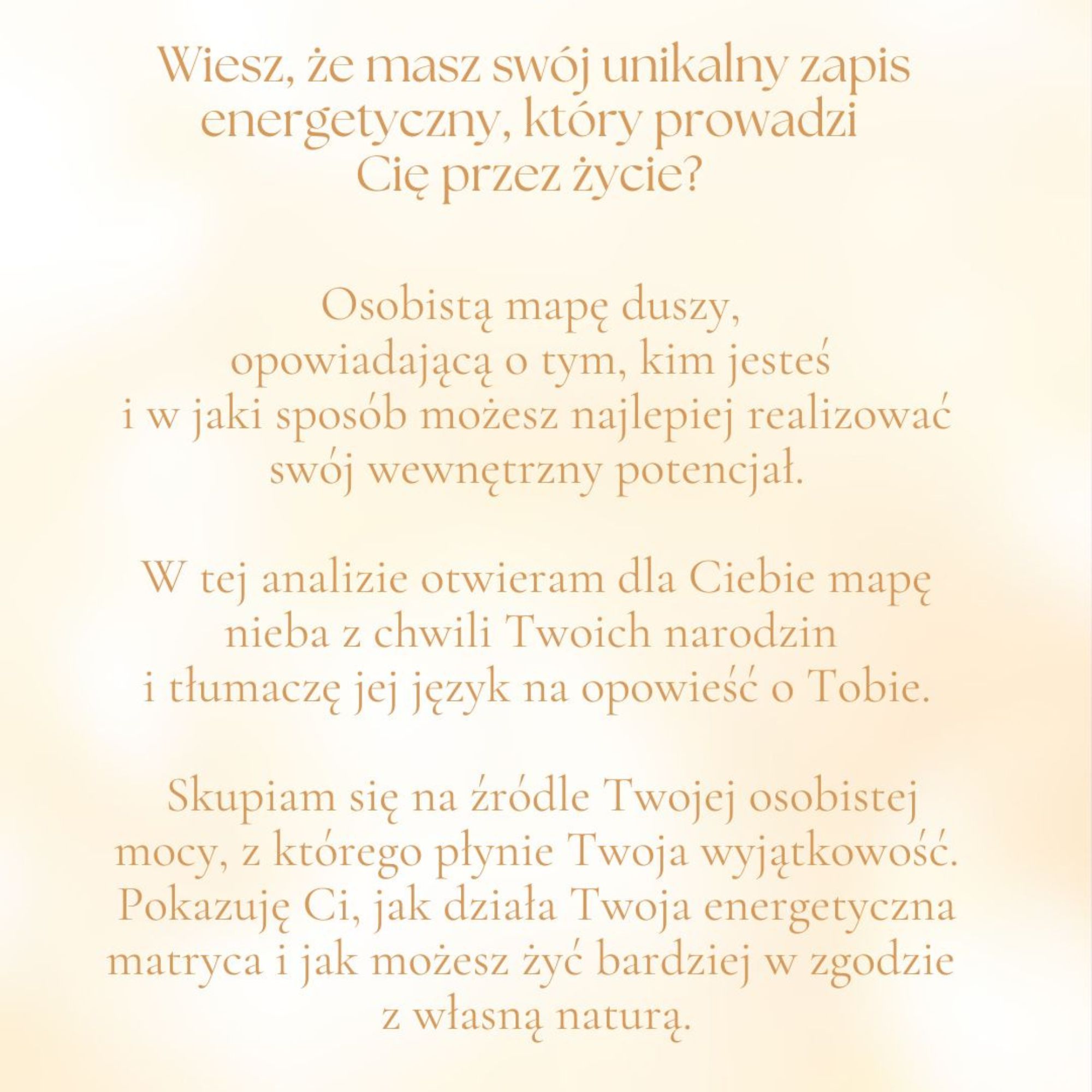 W tej analizie otwieram dla Ciebie mapę nieba z chwili Twoich narodzin i tłumaczę jej język na opowieść o Tobie. Skupiam się na źródle Twojej osobistej mocy, z którego płynie Twoja wyjątkowość. Pokazuję Ci, jak działa Twoja energetyczna matryca i jak możesz żyć bardziej w zgodzie z własną naturą.