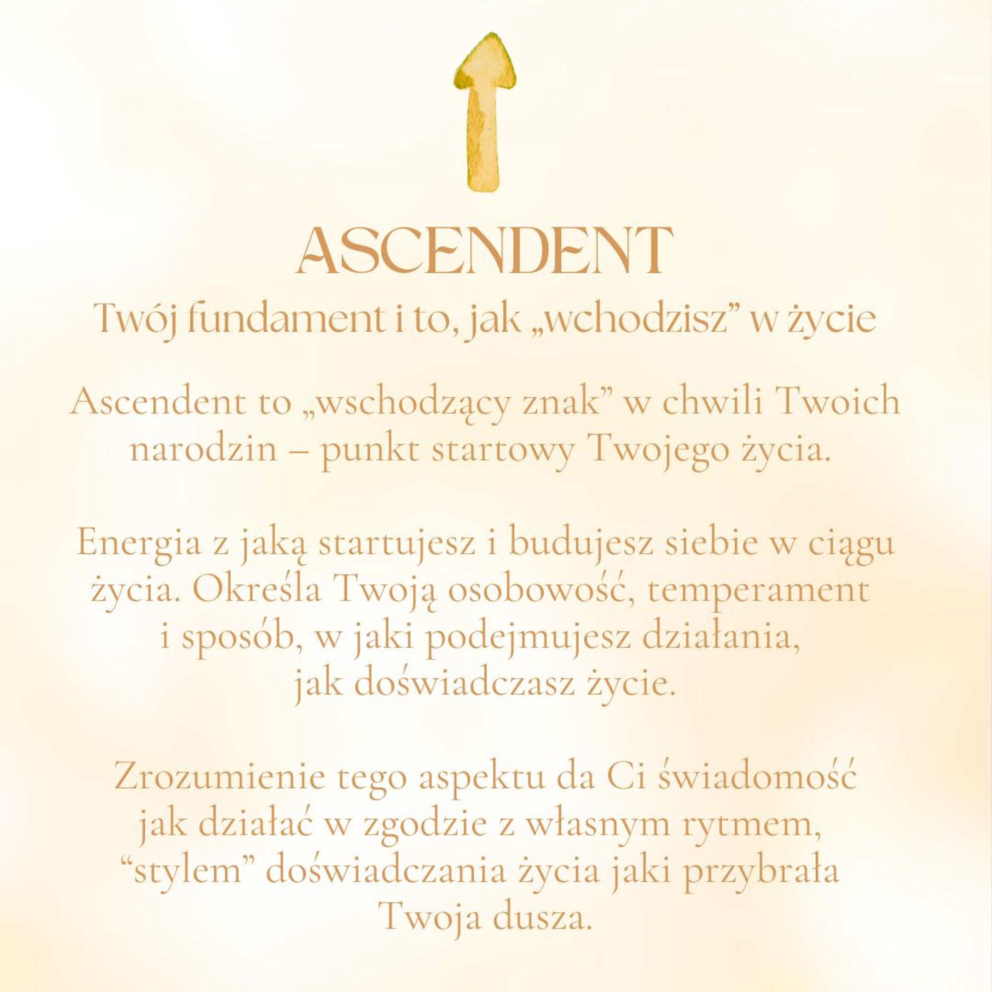 Ascendent to „wschodzący znak” w chwili Twoich narodzin – punkt startowy Twojego życia. Energia z jaką startujesz i budujesz siebie w ciągu życia. Określa Twoją osobowość, temperament i sposób, w jaki podejmujesz działania, jak doświadczasz życie. Zrozumienie tego aspektu da Ci świadomość jak działać w zgodzie z własnym rytmem, “stylem” doświadczania życia jaki przybrała Twoja dusza.