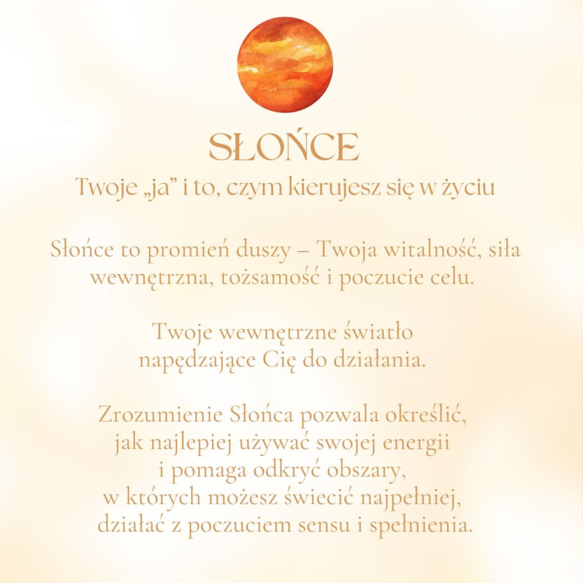 Słońce to promień duszy – Twoja witalność, siła wewnętrzna, tożsamość i poczucie celu. Twoje wewnętrzne światło napędzające Cię do działania. Zrozumienie Słońca pozwala określić, jak najlepiej używać swojej energii i pomaga odkryć obszary, w których możesz świecić najpełniej, działać z poczuciem sensu i spełnienia.