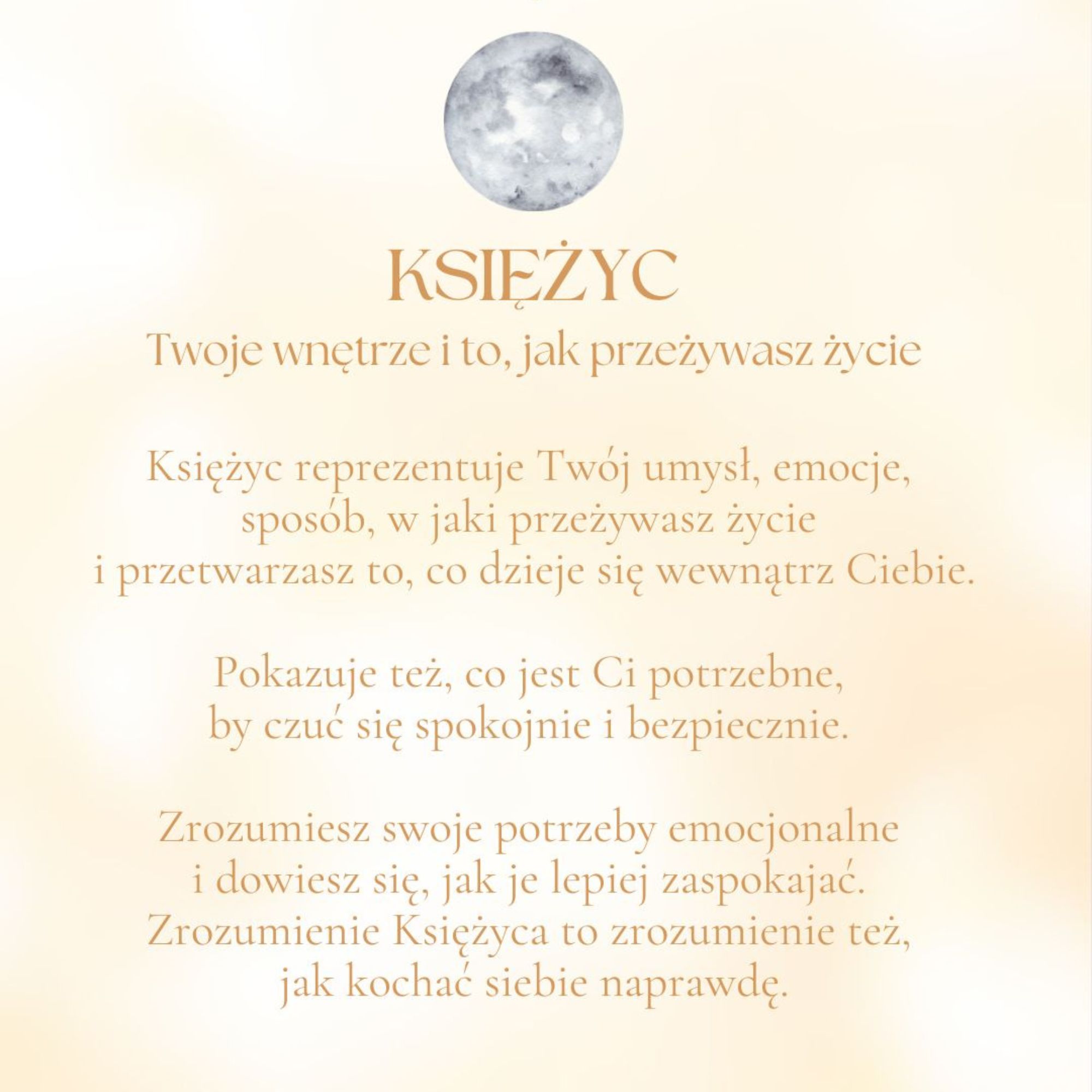 Księżyc reprezentuje Twój umysł, emocje, sposób, w jaki przeżywasz życie i przetwarzasz to, co dzieje się wewnątrz Ciebie. Pokazuje też, co jest Ci potrzebne, by czuć się spokojnie i bezpiecznie. Zrozumiesz swoje potrzeby emocjonalne i dowiesz się, jak je lepiej zaspokajać. Zrozumienie Księżyca to zrozumienie też, jak kochać siebie naprawdę.