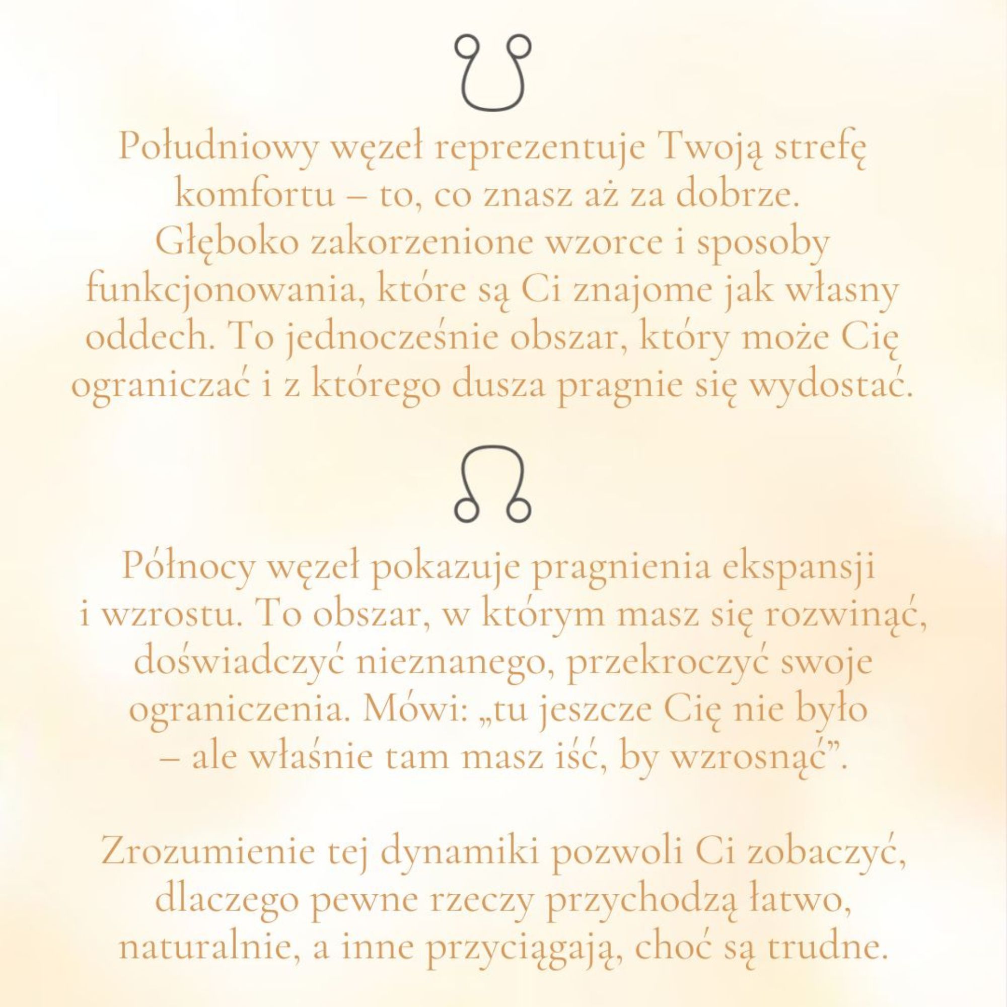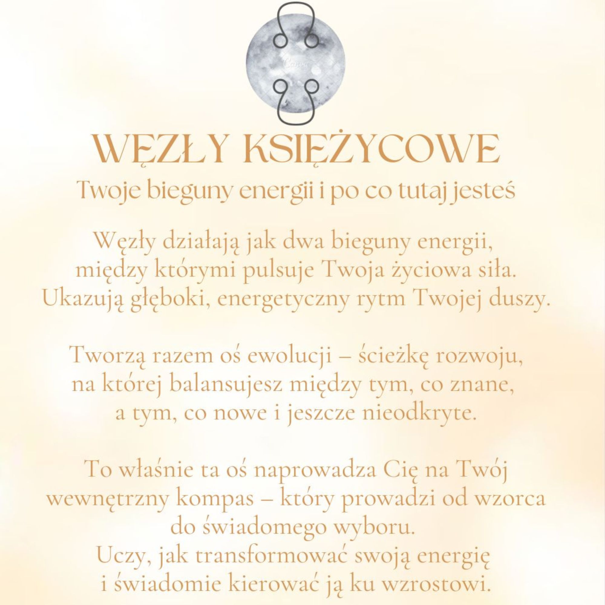 Węzły księżycowe działają jak dwa bieguny energii, między którymi pulsuje Twoja życiowa siła. Ukazują głęboki, energetyczny rytm Twojej duszy. Tworzą razem oś ewolucji – ścieżkę rozwoju, na której balansujesz między tym, co znane, a tym, co nowe i jeszcze nieodkryte.