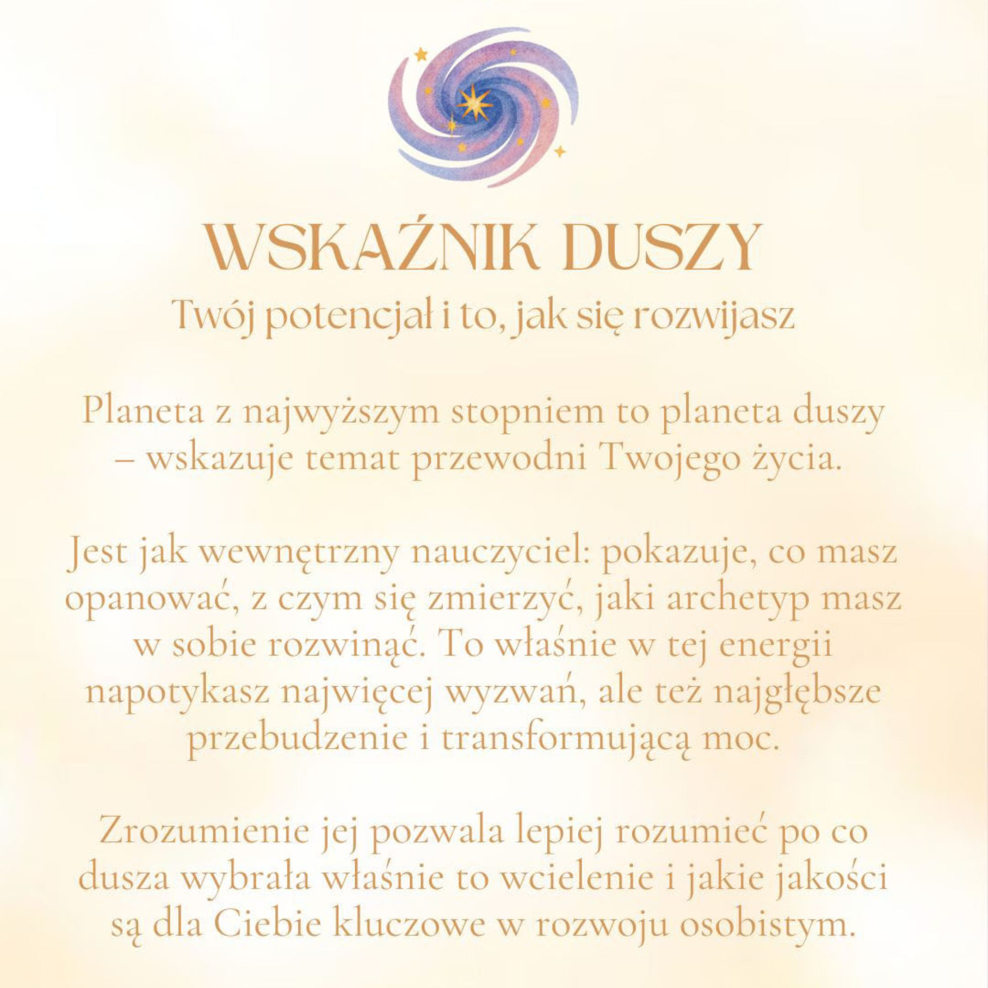 Planeta z najwyższym stopniem to Twoja osobista planeta duszy, najważniejszy wskaźnik osobisty – wskazuje temat przewodni Twojego życia. Jest jak wewnętrzny nauczyciel: pokazuje, co masz opanować, z czym się zmierzyć, jaki archetyp masz w sobie rozwinąć. To właśnie w tej energii napotykasz najwięcej wyzwań, ale też najgłębsze przebudzenie i transformującą moc. Zrozumienie Wskaźnika Duszy pozwala lepiej rozumieć po co dusza wybrała właśnie to wcielenie i jakie jakości są dla Ciebie kluczowe w rozwoju osobistym.