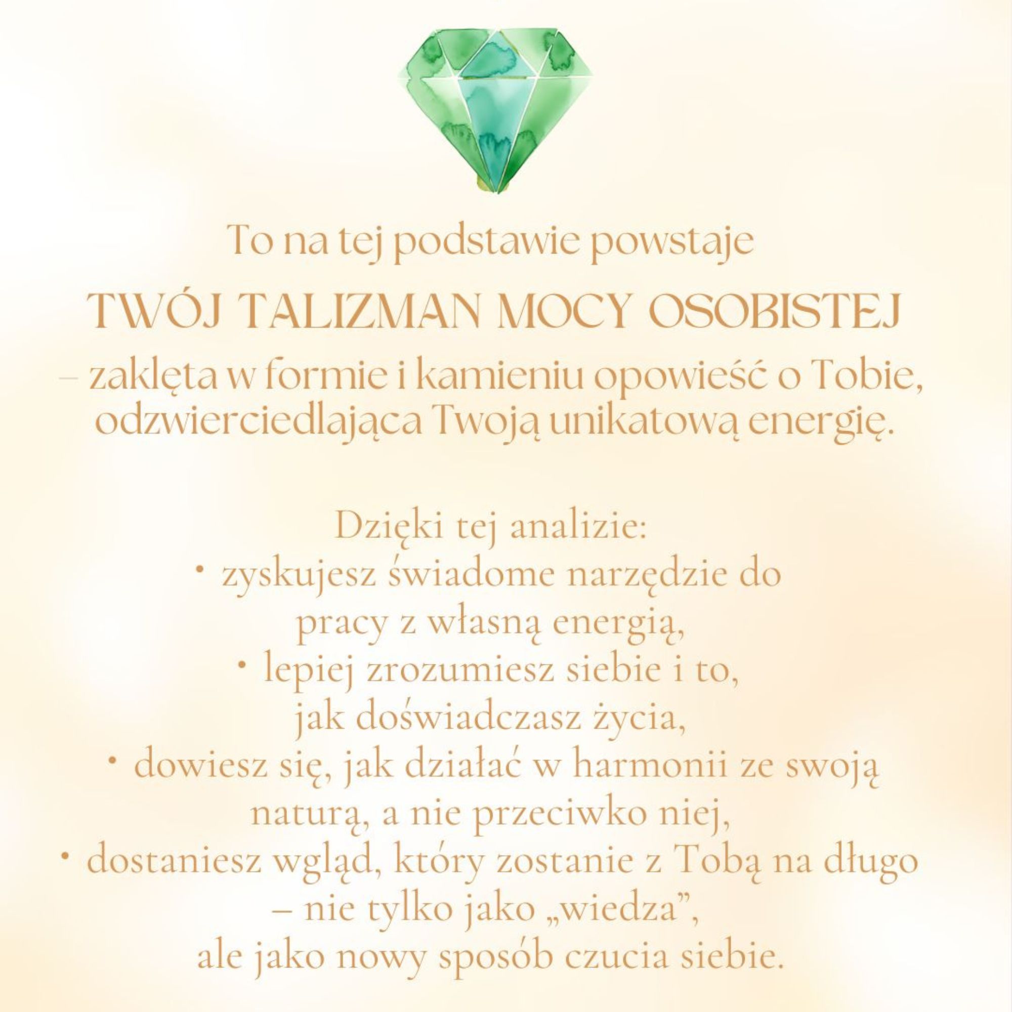 To na tej podstawie powstaje Twój talizman mocy osobistej – zaklęta w formie i kamieniu opowieść o Tobie, odzwierciedlająca Twoją unikatową energię.